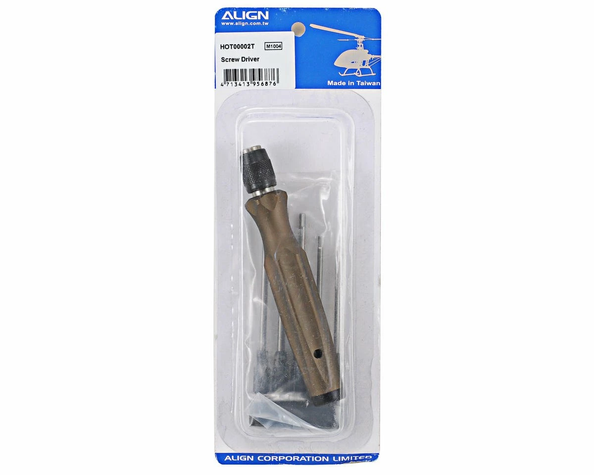 This is an Align Hex Driver & Phillips Head Tool Set. These tips are machined from HSS high alloy steel to help prevent wear and distortion, and were built to withstand the abuse of long wrenching sessions. The CNC machined handle is comfortable and features a quick release chuck to hold the tips securely in place.