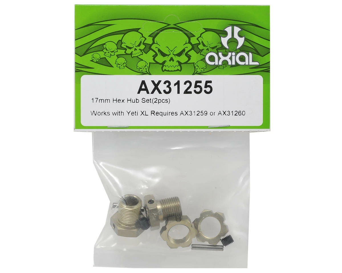 This is a replacement Axial Yeti XL 17mm Hex Hub Set. Industry standard 17mm hex hubs, hard anodized with a 3x17mm steel pin and set screw. The machined serrated 17mm nut helps eliminate wheels from coming loose by biting into the wheel as you tighten them down. Package includes two 17mm axle hubs, two wheel nuts, two cross pins and two set screws.