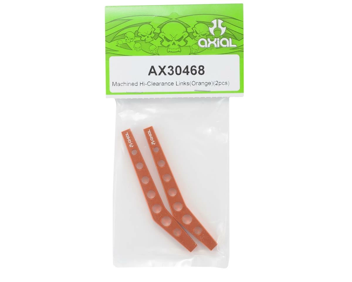 This is a set of two optional orange Machined High-Clearance Links for the Axial Scorpion Rock Crawler. The Axial High-Clearance links are machined from heavy duty aluminum that add increased ground clearance and strength.