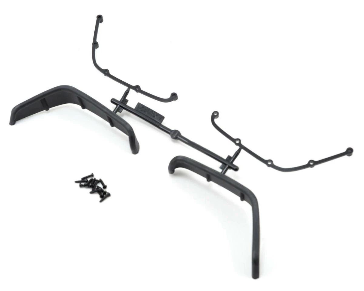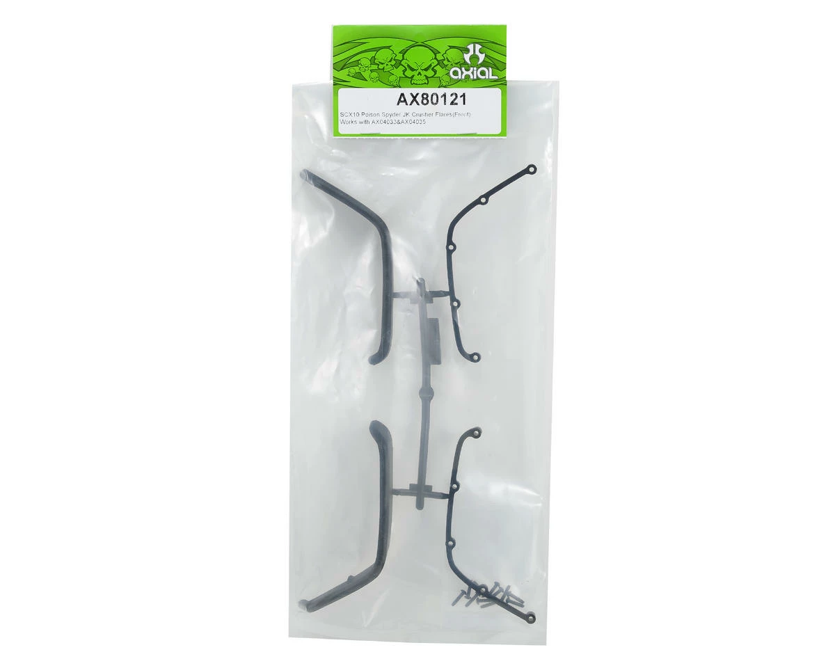 This is a Axial Poison Spyder JK Crusher Front Fender Flare Set. These molded plastic tube front fender flares add style and function to any scale off-road vehicle. Great approach and departure angles help when navigating tight technical terrain. Crusher Flares mount with five button head screws that tie into a molded plastic backing to fully capture the polycarbonate body for strength and durability.
