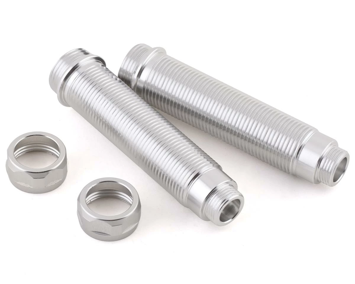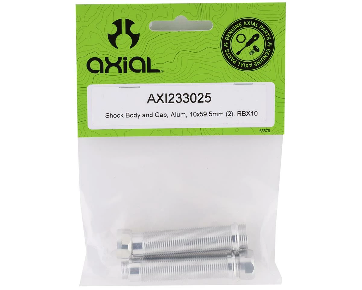 Axial RBX10 Ryft Aluminum 10×59.5mm Shock Body & Cap. Package includes two replacement shock bodies and outer shock caps used in the rear position.