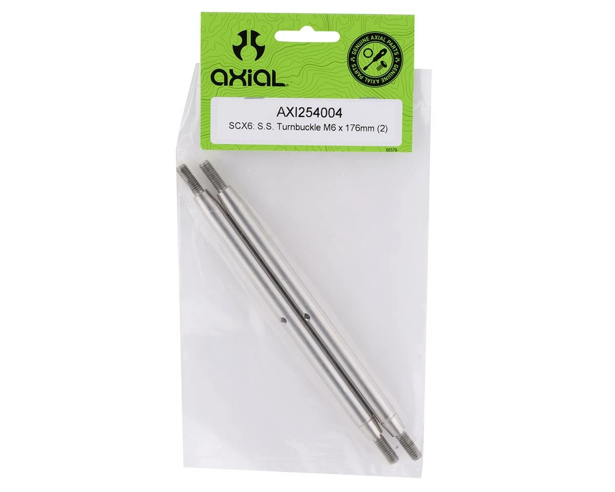 Axial SCX6 6x176mm Stainless Steel Turnbuckle. This replacement turnbuckle is intended for the lower front or lower rear of the Axial SCX6 chassis. Package includes one stainless steel turnbuckle.
