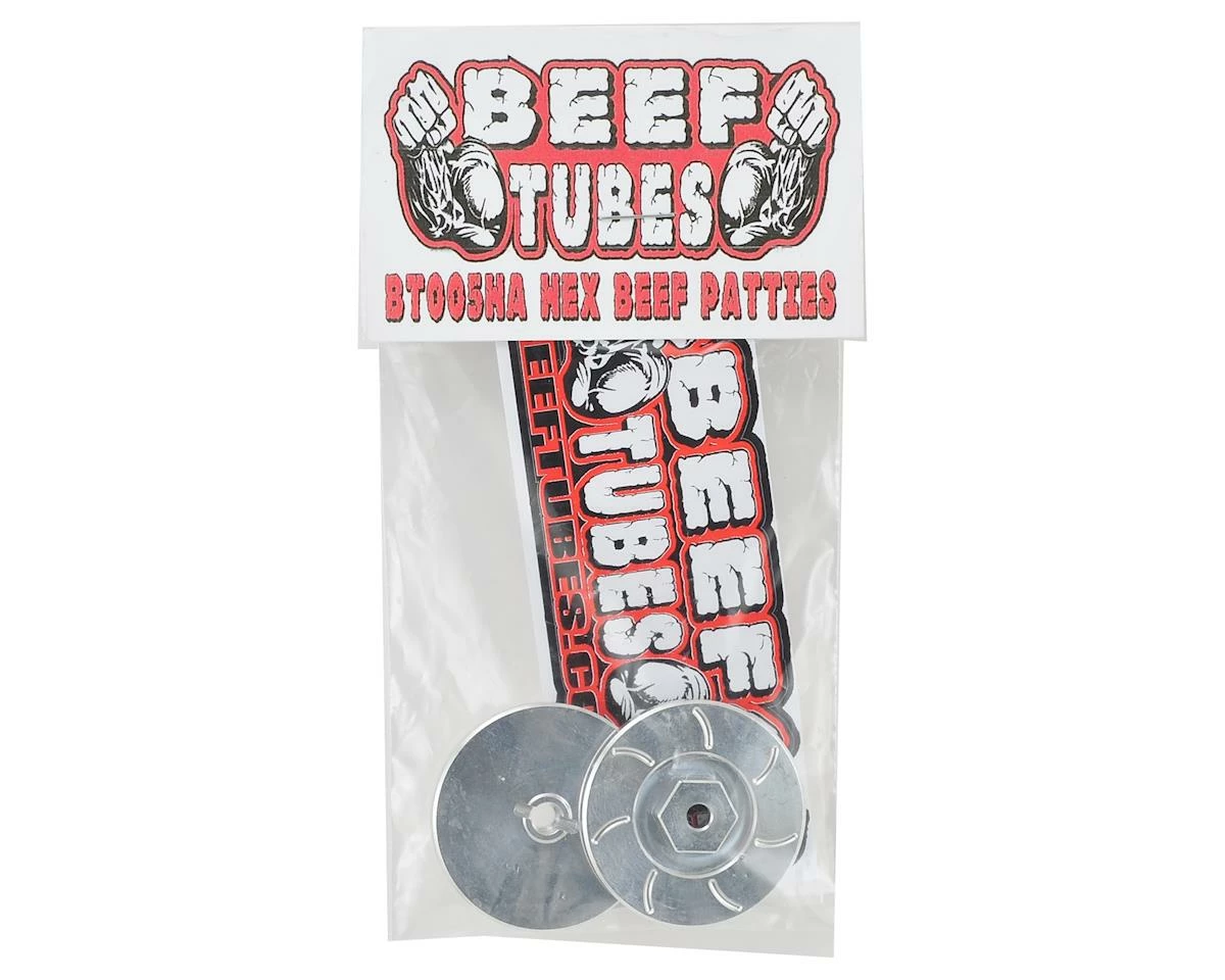Beef Tubes Aluminum Hex Style Beef Patties add an additional 0.7 ounces of weight to your rig. Just as important, the machined brake rotor look means they are recognized as a scale point at SORRCA competitions! Machined from solid 7075 aluminum, these can be painted or powder coated to further increase the scale look. Package includes two beef patties.