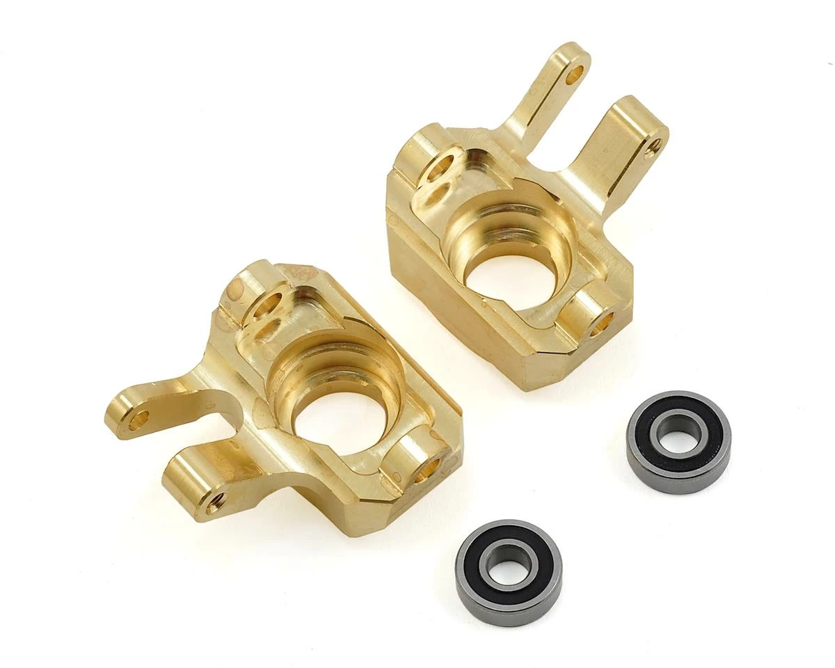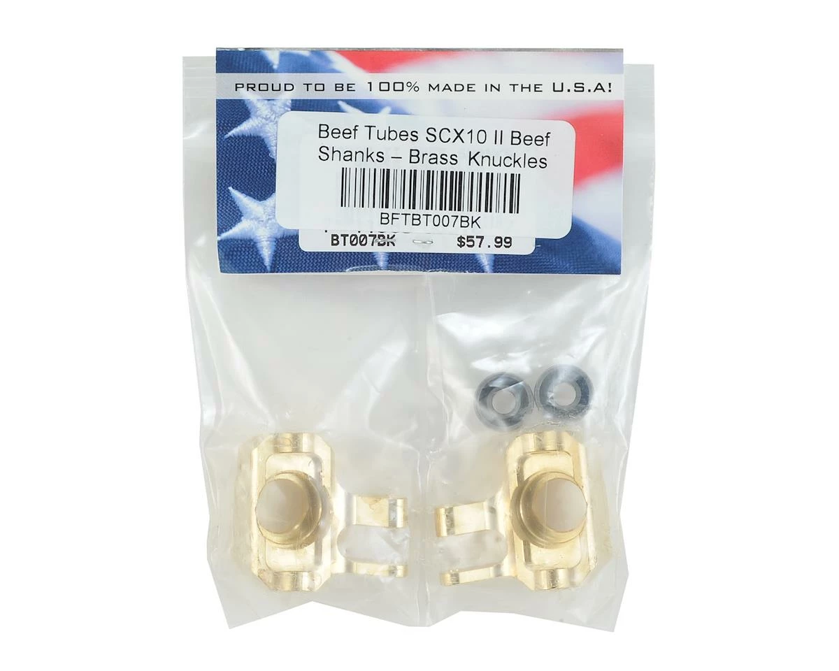 Beef Tubes SCX10 II Beef Shank Brass Knuckles add a total of 98 grams of weight were it counts, the lowest outer most part of your rig, lowering the overall center of gravity, increasing climbing stability/ability. Another feature that makes Beef Shanks stand above the others is that our design uses a larger and stronger 5x13x4mm outer bearing vs. the stock 5x11x4mm bearing which also increases durability. These are a direct fit to almost any AR44 c-hub and provide improved performance with increased scale realism.