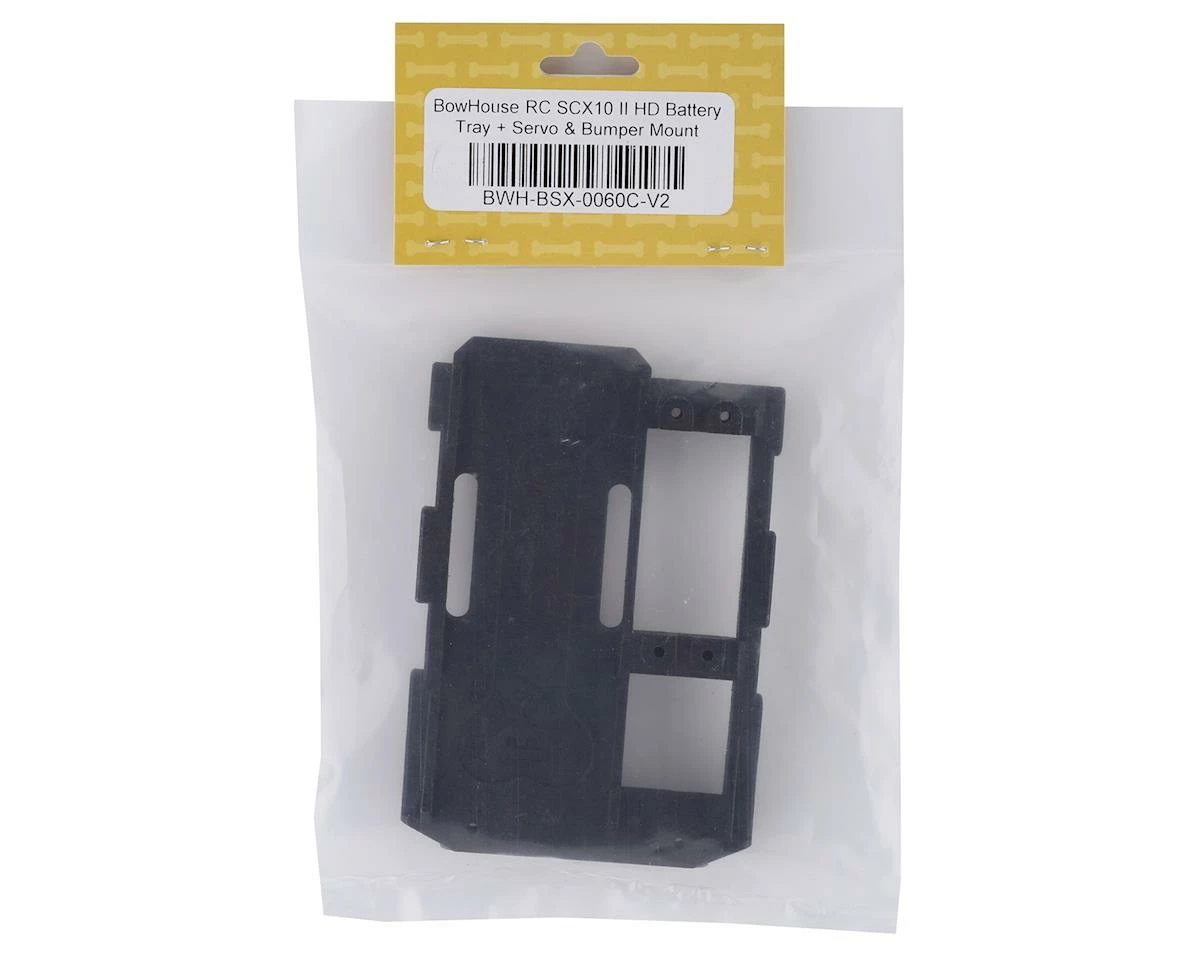 The BowHouse RC SCX10 II HD Battery Tray + Servo & Bumper Mount is perfect for drivers that run steering servos with massive torque and push their trucks to the limits! Every aspect of the popular BowHouse battery tray and servo mounts have been strengthened and the addition of a beefy front bumper mount creates even more strength. To top it off, a fairlead has been incorporated for those that run a servo winch (servo winch mount not included – BWH-BSX-0070C). This part is printed in-house in ultra-light, ultra-strong carbon fiber nylon.