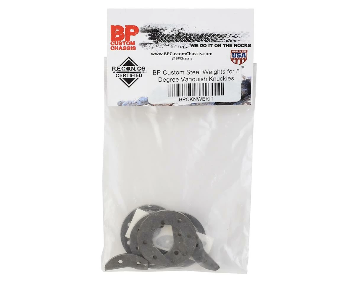 BPC Steel Vanquish 8 Degree Knuckle Weights add 3 ounces of weight down low, without adding rotational mass. These stainless steel weights were designed to fit Vanquish Products SCX10 8 degree knuckles, and may fit other brands with some modification. By stacking weight on the knuckles, instead of weighting your tires it reduces stress on your drivetrain and creates a more efficient overall build. Adds 1.5oz to each knuckle, totaling 3oz. Made in the U.S.A.