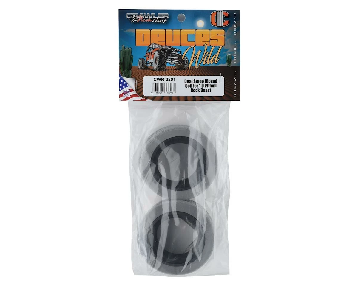 This is a set of Crawler Innovations “Deuce’s Wild” 1.9″ XL Dual Stage Crawler Foams, featuring CI’s dense car stand foam, cut and shaped into the inner foam. This dense inner offers superior steering response and a firm foundation for the second stage. The second stage is standard gray foam, and when combined this pairing is 100% water proof. These foams provide a firmness not widely found on the market and don’t fold and bend as others do, despite the load or speed. These foams rely on a small air gap between the foam and the tire, which allows the tire to obtain traction while supported by the foam.