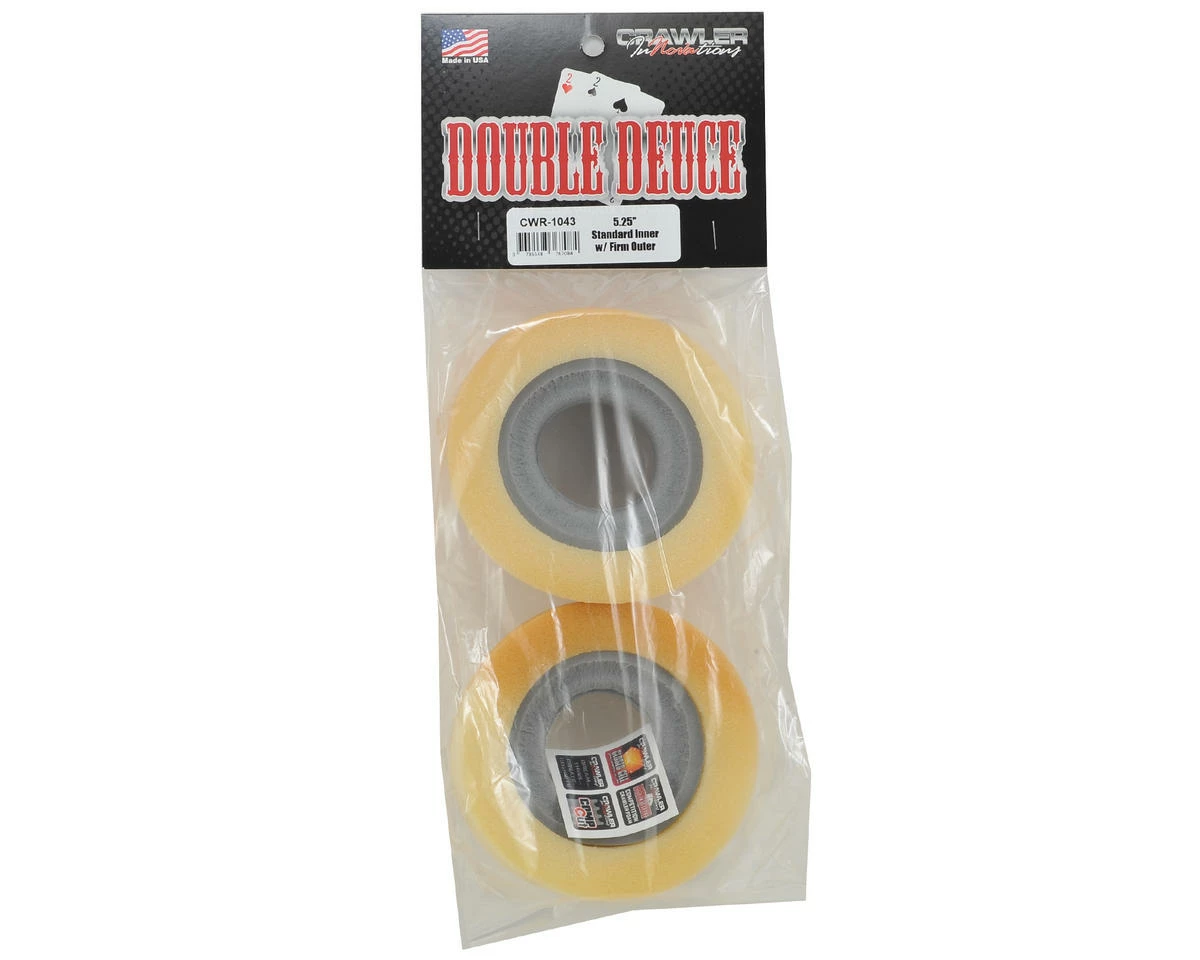 This is a pack of two Crawler Innovations Double Deuce 5.25 Standard Crawler Tire Inserts. These inserts feature a standard inner foam, with a hard density outer foam. Crawler Innovations has brought a unique material and insert design to the crawler world that will dramatically improve the performance of your rig. The Double Deuce design features a closed cell inner foam combined with a conventional outer foam insert. The closed cell inner foam is super dense, water proof, is not temperature sensitive and is extremely durable. The conventional outer foam is not temperature sensitive, but it is not water proof.