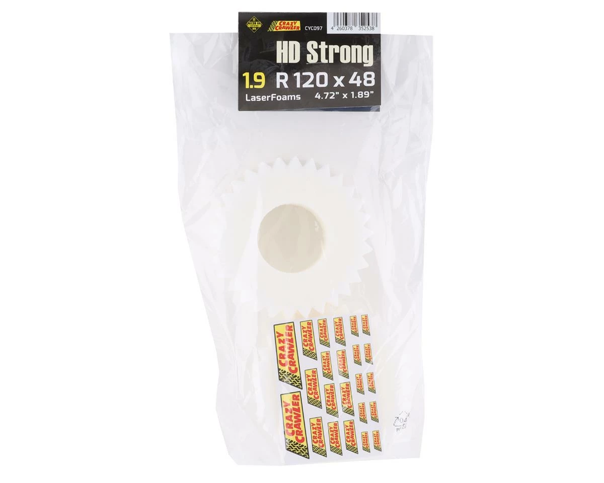 Crazy Crawler LaserFoam “HD Strong 120x48mm” 1.9 Foam Crawler Tire Inserts are precision cut open cell foam tire inserts designed for performance. LaserFoam inserts offer incredible lateral stability and sidewall support, yet still remain nice and soft on the contact patch. The material and cut shape ensure that the tire only rolls in the area of the tread that is in contact with the surface, creating great driving characteristics and an incredibly scale look. Plus, the soft open cell foam material allows the insert to fit even when internal weight is added.