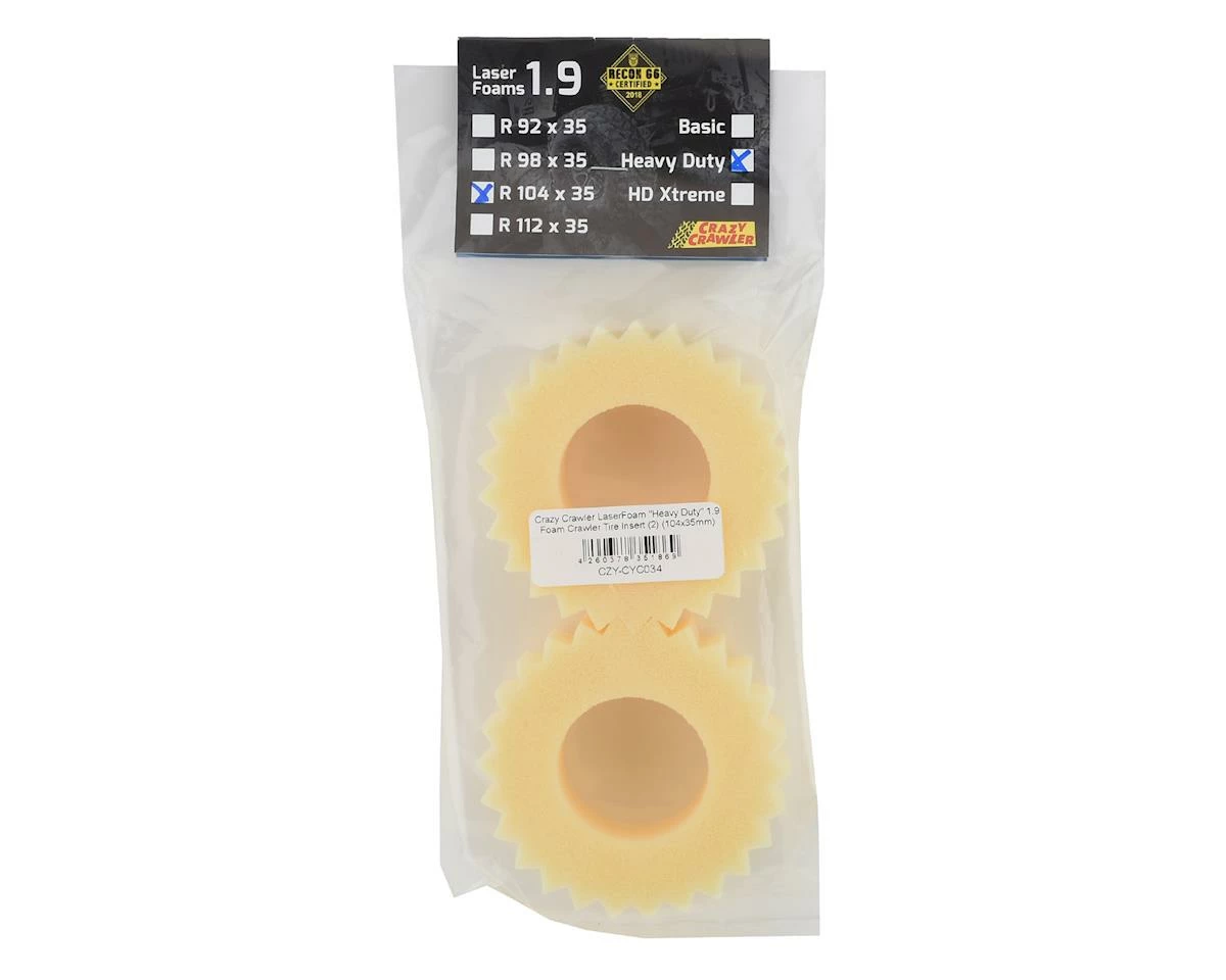 Crazy Crawler LaserFoam “Heavy Duty 104×35” 1.9 Foam Crawler Tire Inserts are precision cut open cell foam tire inserts designed for performance. LaserFoam inserts offer incredible lateral stability and sidewall support, yet still remain nice and soft on the contact patch. The material and cut shape ensure that the tire only rolls in the area of the tread that is in contact with the surface, creating great driving characteristics and an incredibly scale look. Plus, the soft open cell foam material allows the insert to fit even when internal weight is added.