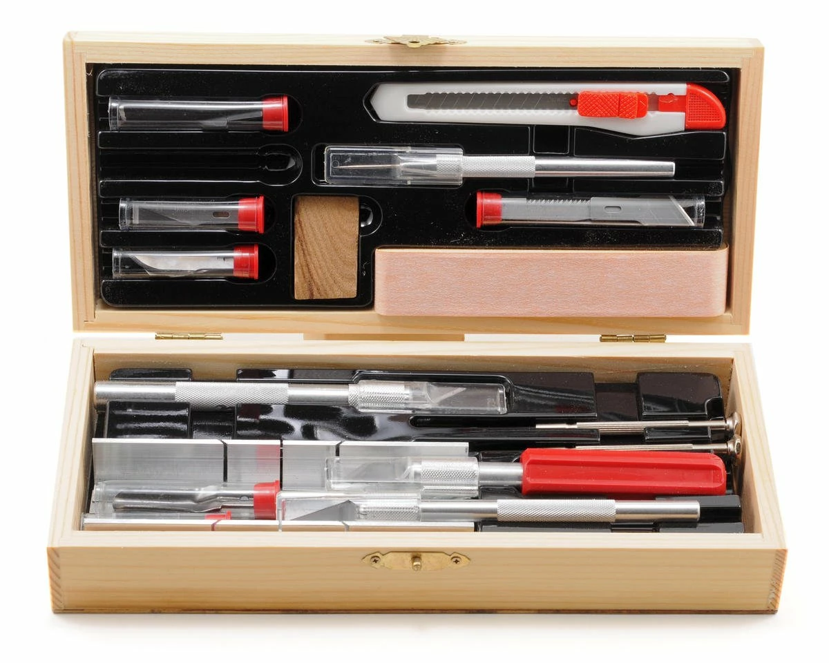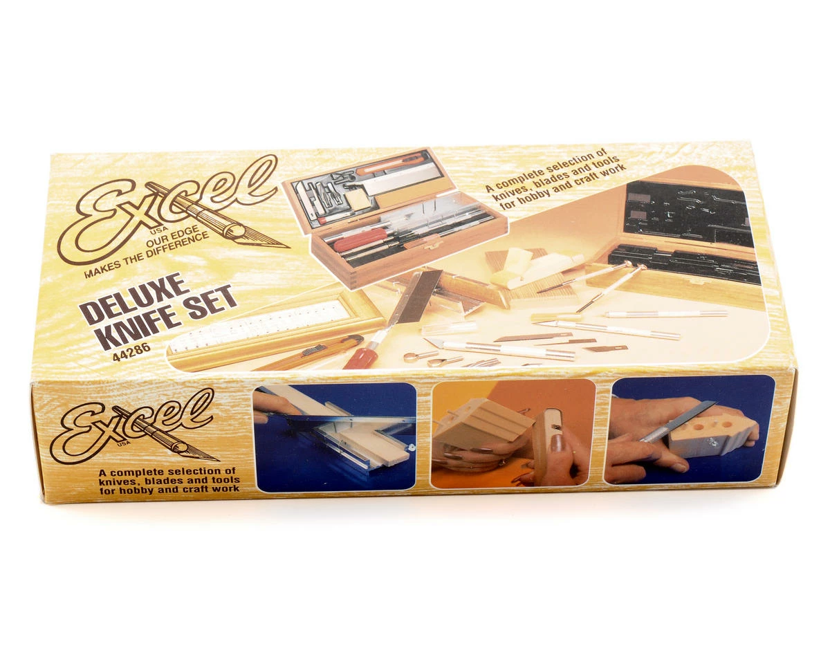 This is the Excel Deluxe Boxed Knife Set. This set was developed to suit the needs of beginners or professionals. Packaged in a genuine wooden chest to allow easy access and convenient storage.