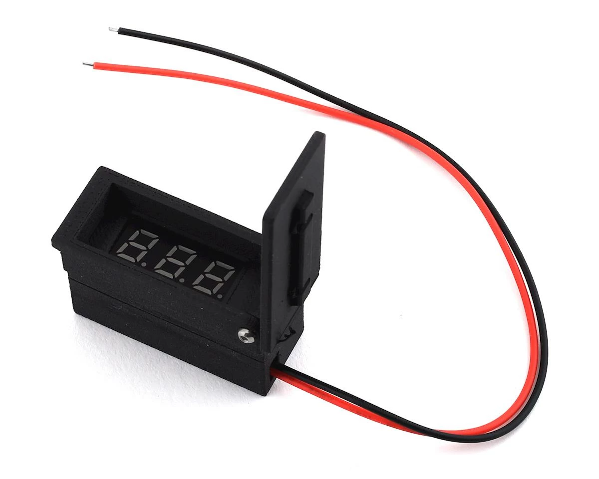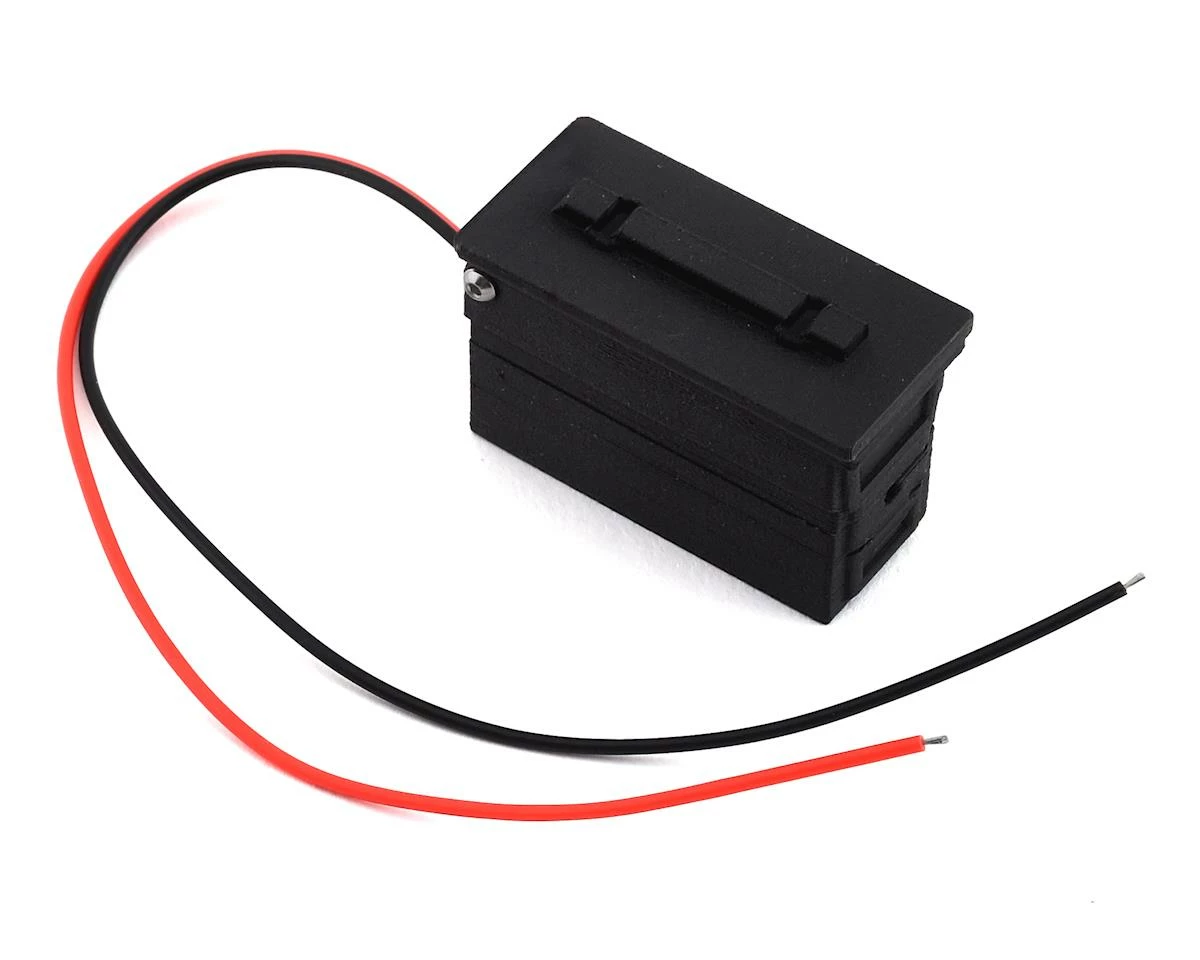 The voltage meter is housed inside a scale ammo can that measures approximately 42.5x20x28.5mm (LxWxH), so it can be hidden inside your rig easily. The wires are left open ended so you can add the connector you prefer, and its printed in high quality carbon nylon filament, creating a stronger part with finer detail than a PLA filament print. Plus, carbon nylon is easier to paint and sands better than other types of filament, so you can add more details if you choose.