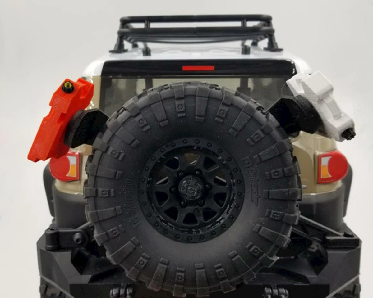 The Exclusive RC HPI Venture Rear Tire Mount is a 3D printed X-mount that features a spare tire mount, with two Rotopax mounts – one on each side, and it was designed to fit the stock bumper. The Rotopax mounts fit Exclusive 2 gallon Rotopax jugs perfectly and the mounts are adjustable to fit a range of tire sizes.