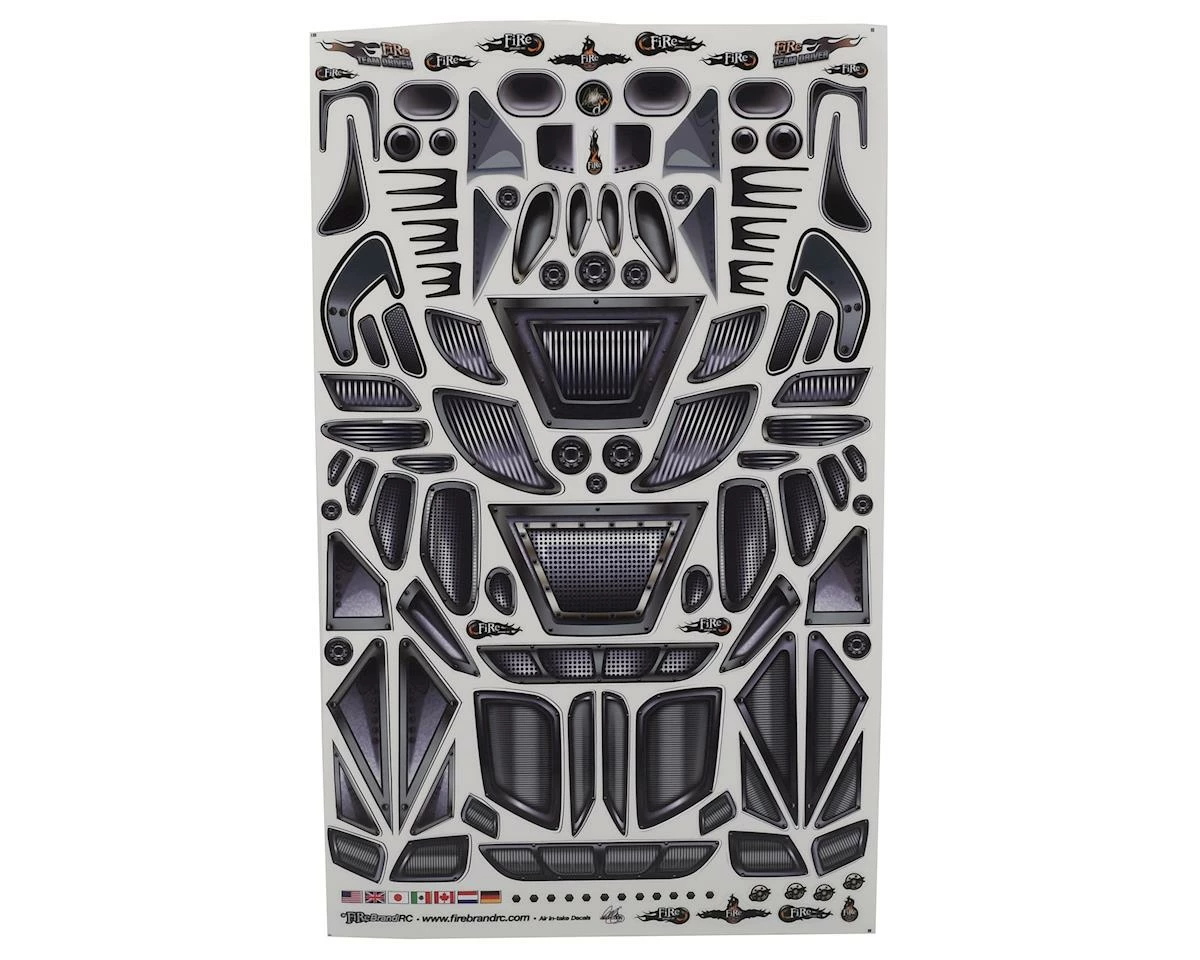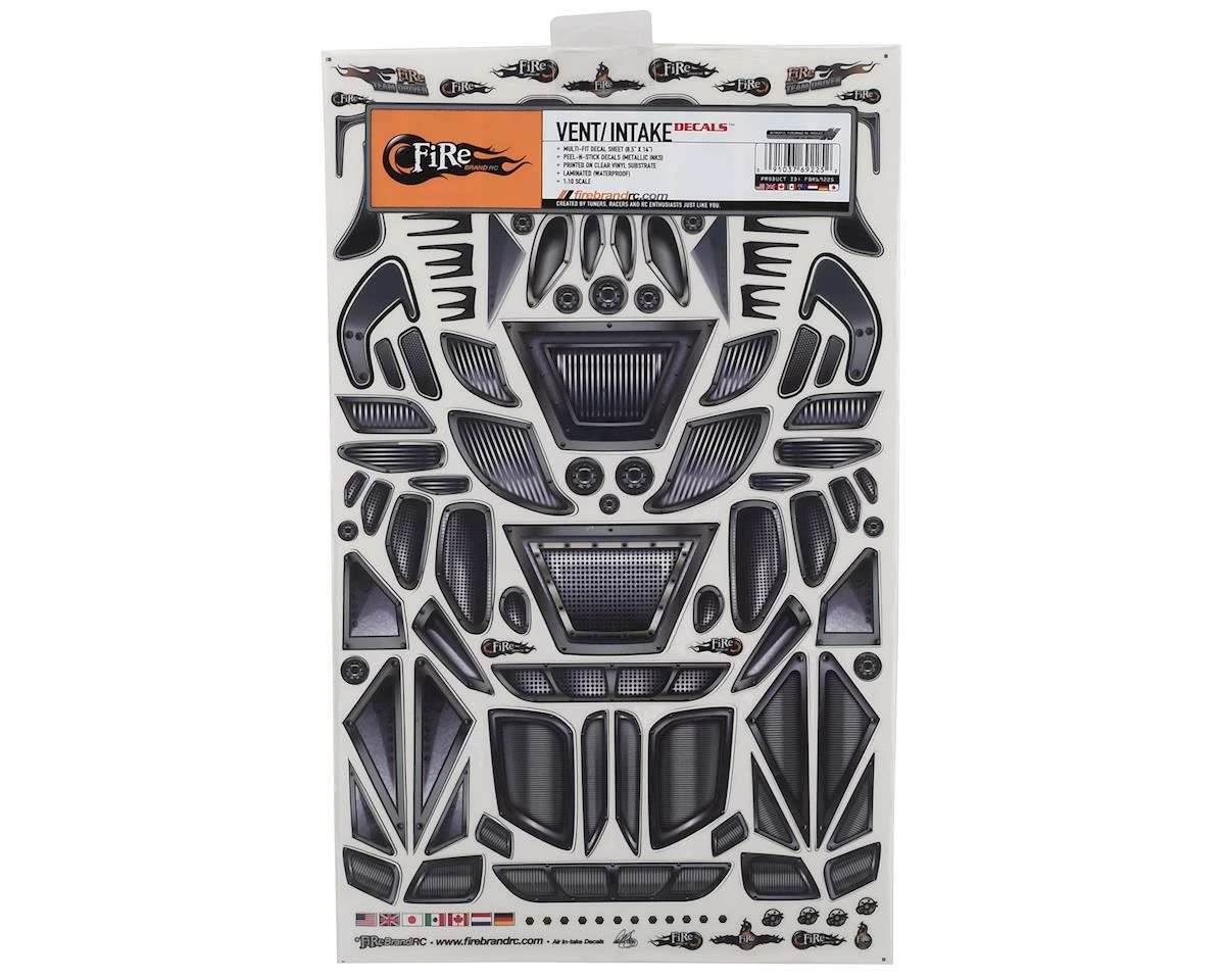 The Firebrand Air Intakes & Vents Multi-Fit Decal Sheet is designed to give your body a unique, “next-level” look. Exclusive, FireBrand RC Multi-fit decal sheets are designed to fit any 1:10 scale (or similar) remote-controlled car, truck, plane, helicopter or boat body.