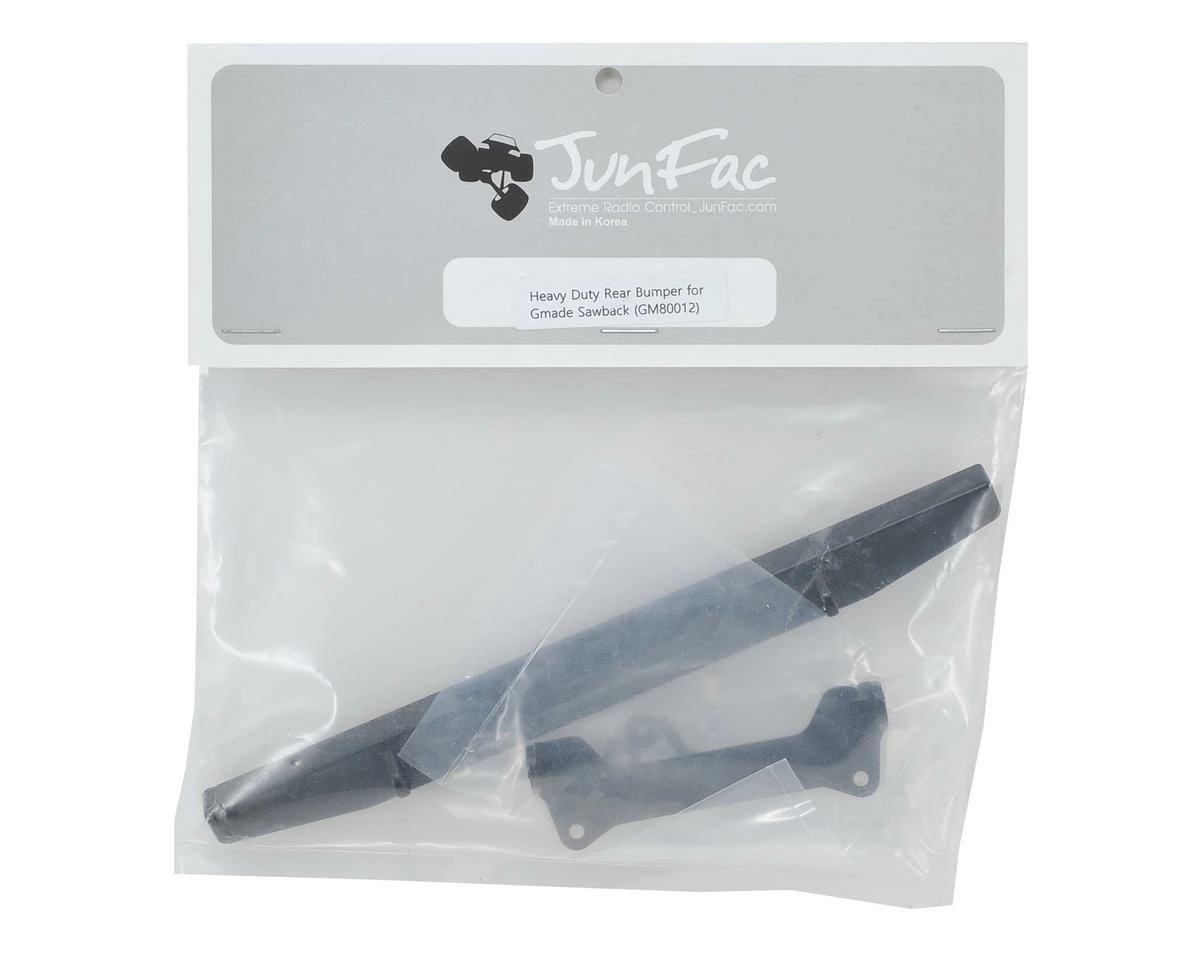 The JunFac Heavy Duty Rear Bumper is CNC machined from aircraft aluminum alloy material and is a direct fit for the Gmade Komodo and Sawback scale crawlers. The black powered coated bumper includes the necessary brackets and hardware and features two tow locations to install your own shackles.