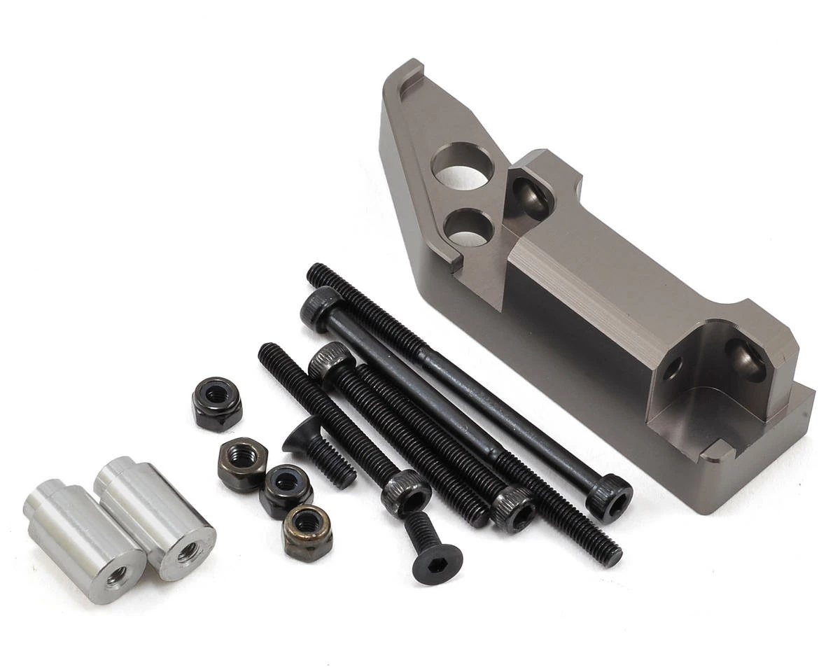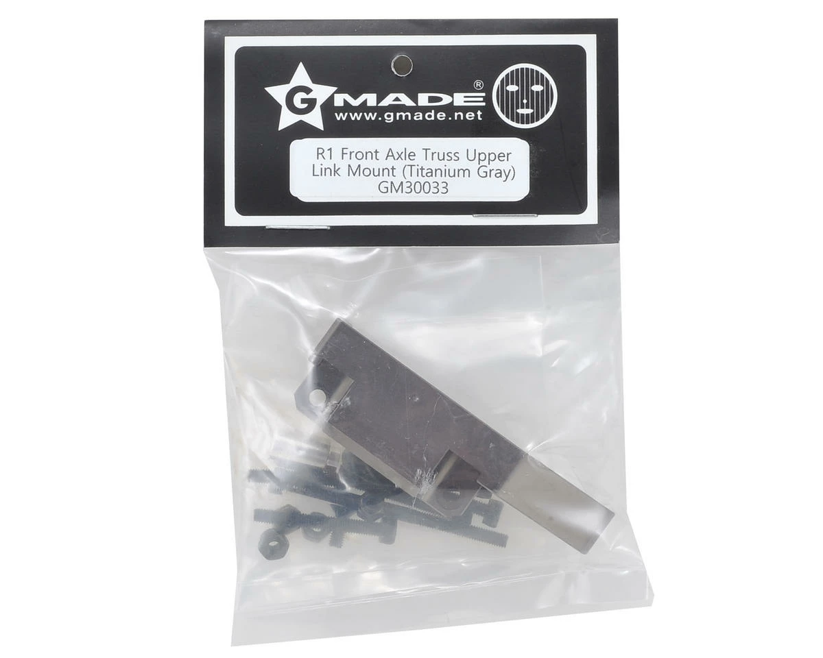 Gmade R1 Aluminum Front Axle Truss Upper Link Mount. This optional precision machined front axle truss link mount adds strength to the axle housing and provides a solid mounting point for the upper suspension links. This is a must have upgrade for any R1 rig.