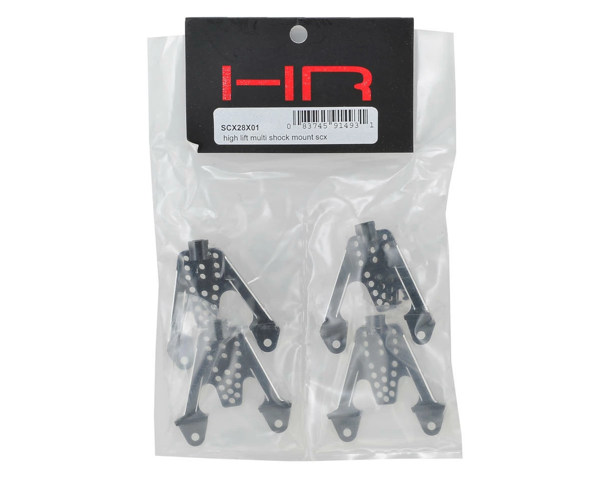 Hot Racing Axial SCX10 Aluminum Multi-Position Shock Hoops are machined from 6061-T6 material, and offer 21 shock mounting options that can raise the ride heigiht by up to 18mm. These hoops are anodized black with chamfered edges for good looks and corosion resistance, and will provide a more solid shock mounting point when compared to the stock plastic hoops.