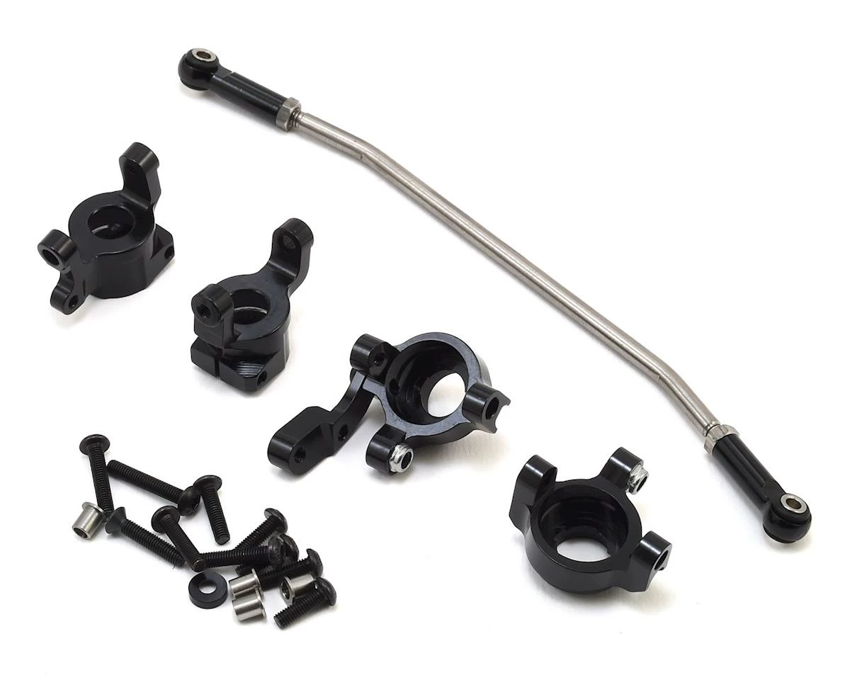 The Hot Racing Axial SCX10 II Aluminum C-Hub & Knuckle Set is a black anodized aluminum, hi-steer steering knuckle set with c-hubs and tie rod for the Axial AR44 axle.