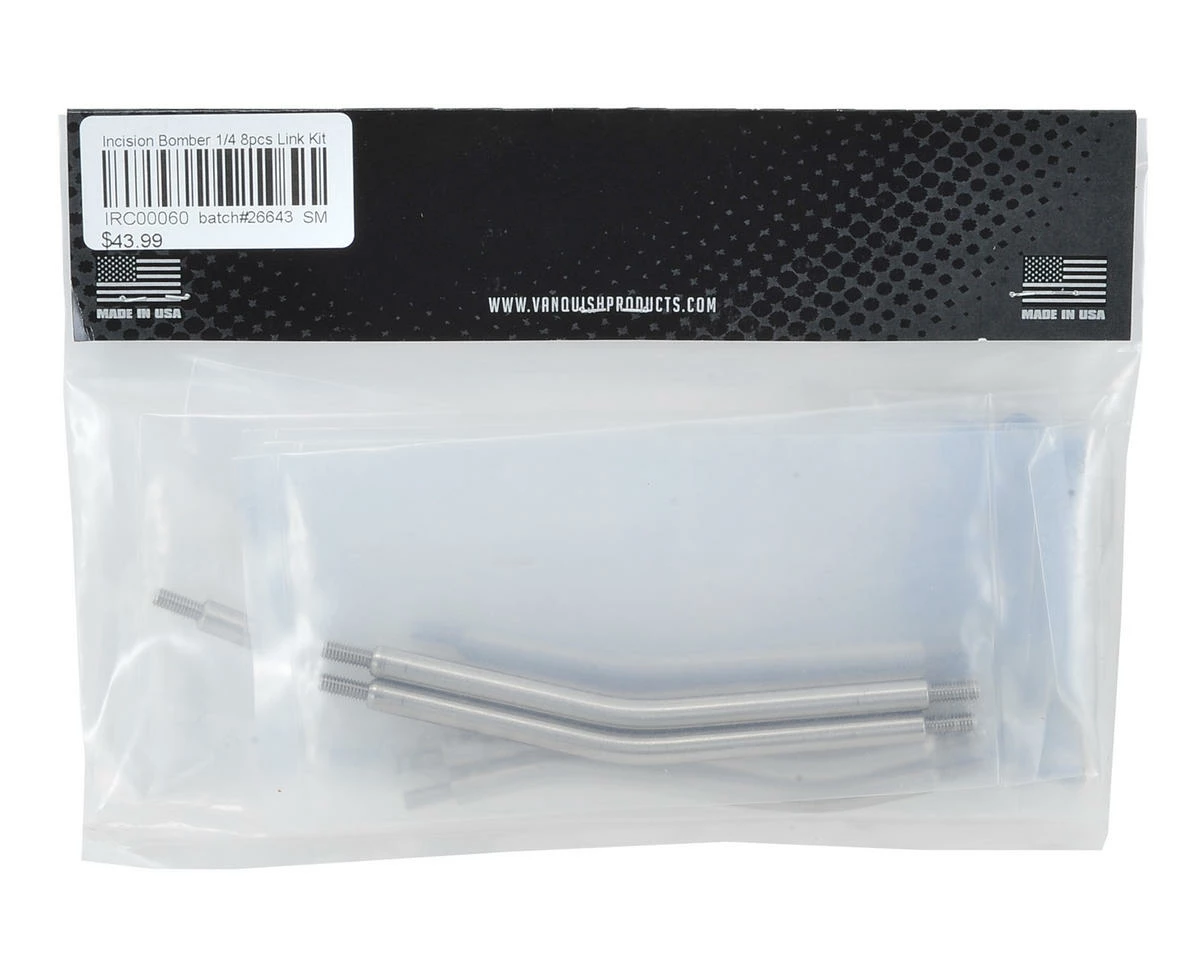 The Incision 1/4 Stainless Steel Link Kit for the Axial RR10 Bomber is a more affordable link option from Vanquish. Featuring the same design and durability features as the renowned Ti Links, but machined from stainless steel for a dramatic price savings.