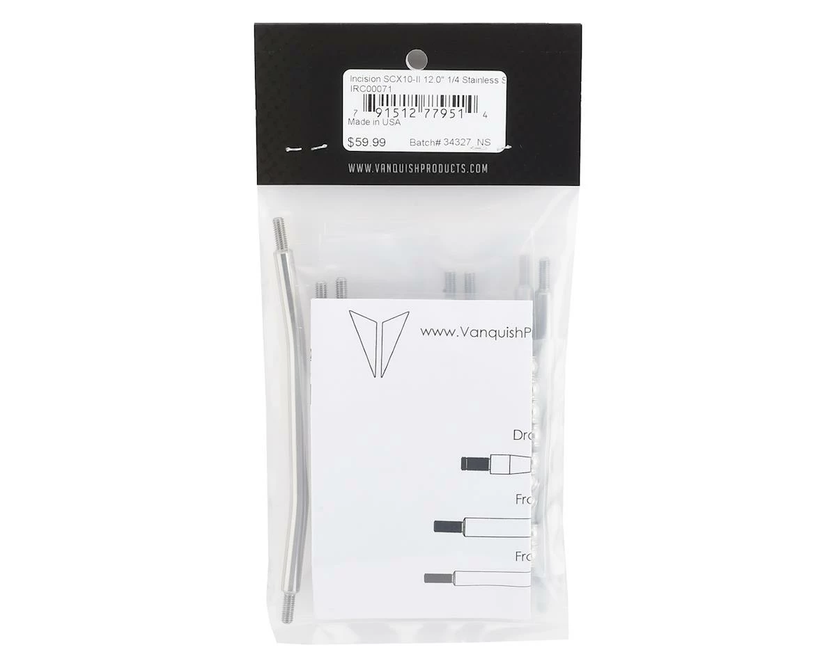 The Incision Wraith 1.9/SCX10 II 12″ Wheelbase 1/4″ Stainless Steel Link Kit is a high quality upgrade for 12″ wheelbase trucks. This kit includes all the links, rod ends and pillow balls you would need to completely replace the stock links with these stainless steel options.