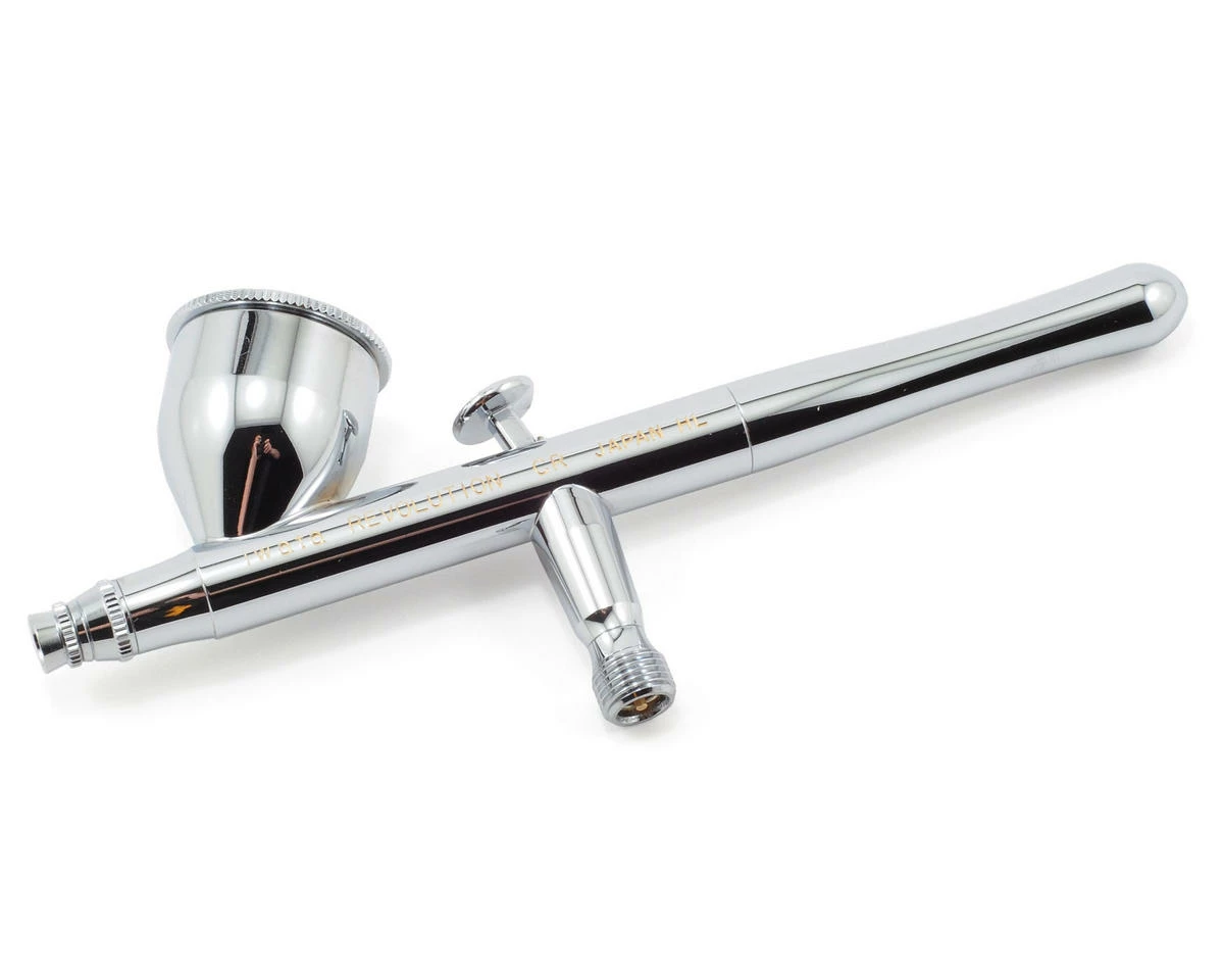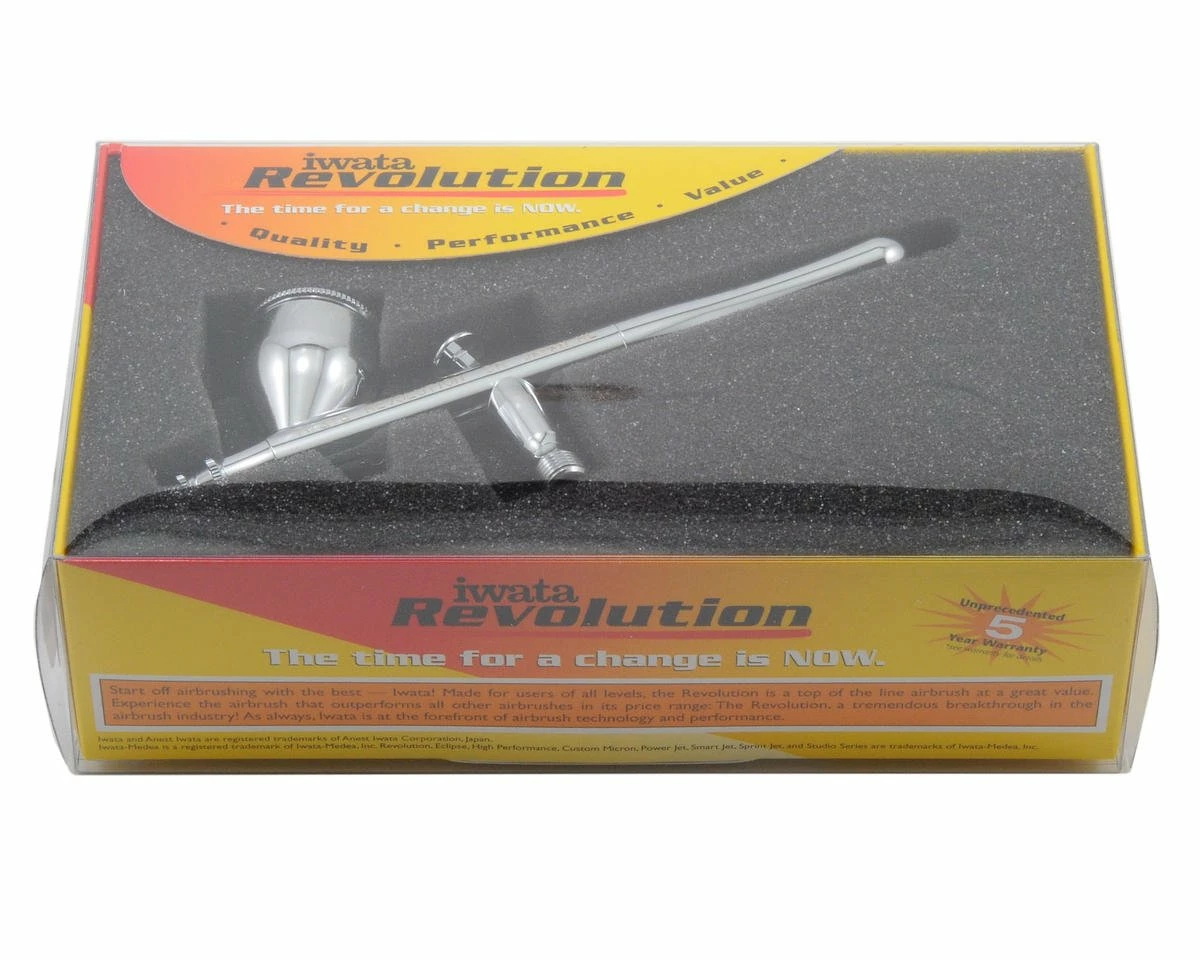 This is the Iwata HP-CR Revolution, dual action, gravity feed airbrush. Start off airbrushing with the industry leader – Iwata. Made for users at all levels, this top-of-the-line Revolution Series brush is a great value. With breakthrough technology and performance, this airbrush outperforms all others in its price range. Its features include: an internal mix airbrush; ergonomic handle design; fine detail to 1-1/2” spray pattern; larger nozzle and needle combination (0.5-mm) that makes for easier spraying of thicker or heavier paints; redesigned trigger mechanism and larger needle-chucking nut for easy assembly; and replaceable internal PTFE needle packing for use with solvent-based paints.