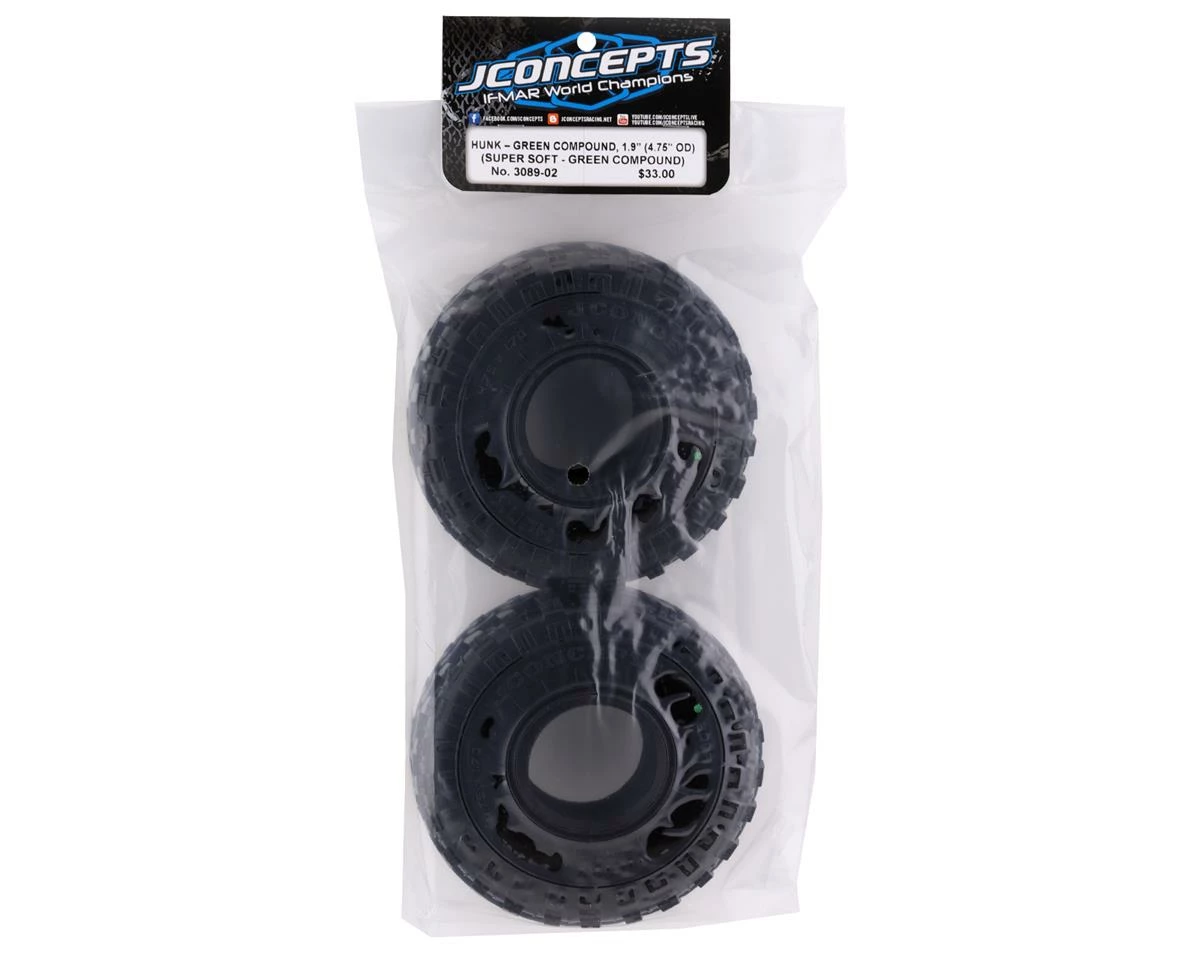 The sidewall lettering features old western JConcepts style, sized, and placed with appropriation. The Hunk has visible part number, overall tire sizing and low sidewall rib and hatch marks near the bead area. The overall height provides plenty of ground clearance over an abundance of terrain. The tires include a star cut medium open cell foam insert capable of standing up to the super soft compound but flexible enough for sharp terrain.
