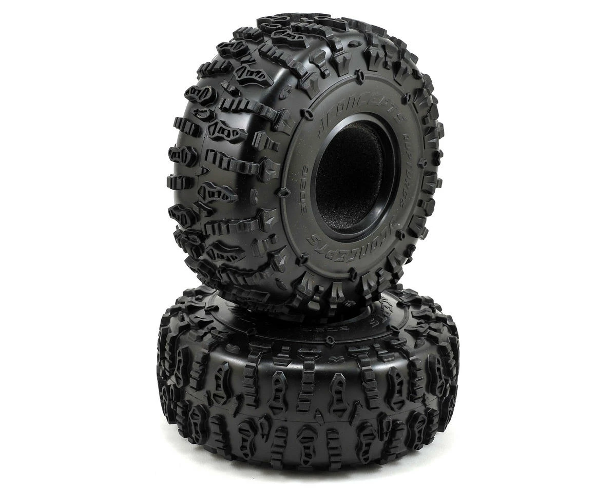 This is a pack of two JConcepts Ruptures 2.2″ Rock Crawler Tires. The super soft green compound grips like a monster, while the tall (151mm) profile tackles even the most treacherous terrain. Perfect for vehicles like the Axial Yeti, the Ruptures are an extremely tacky yet versatile tire crawling and rock racing drivers lust for. The design starts with a layout of individual “large islands” that react to directional and forward loading characteristics like a soft gummy candy. The long horizontal attack bars are connected with solid sidewall detail which braces the sidewall for the high impact situations. The center “mini islands” help maintain spinning speed and at half height provide some space to sling clean during those dirtier runs.