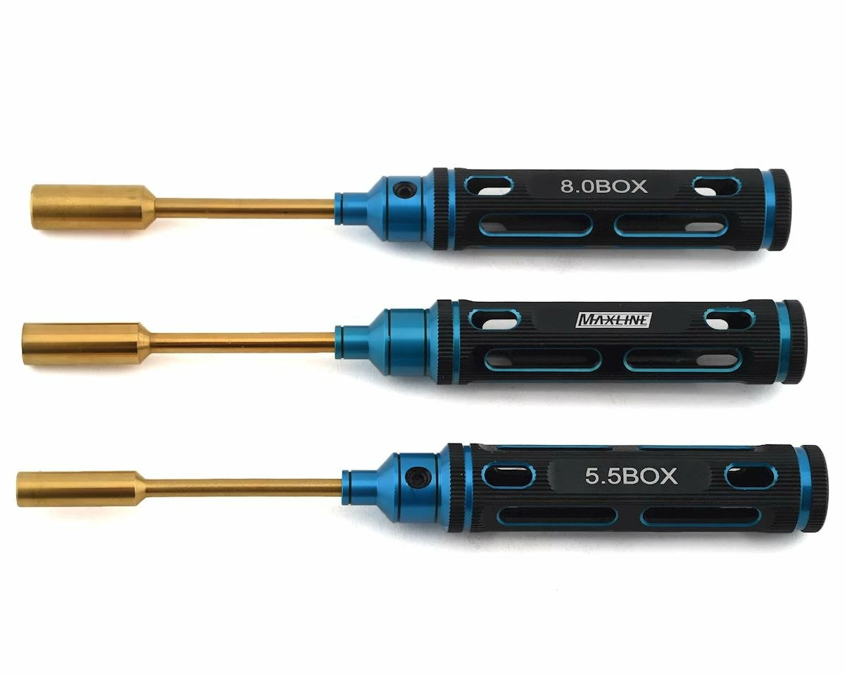 The Maxline Elite Nut Driver Set features 5.5, 7.0 and 8.0mm nut drivers with ergonomic handles and deep wall sockets to offer the best in comfort & fit while wrenching on your R/C cars.