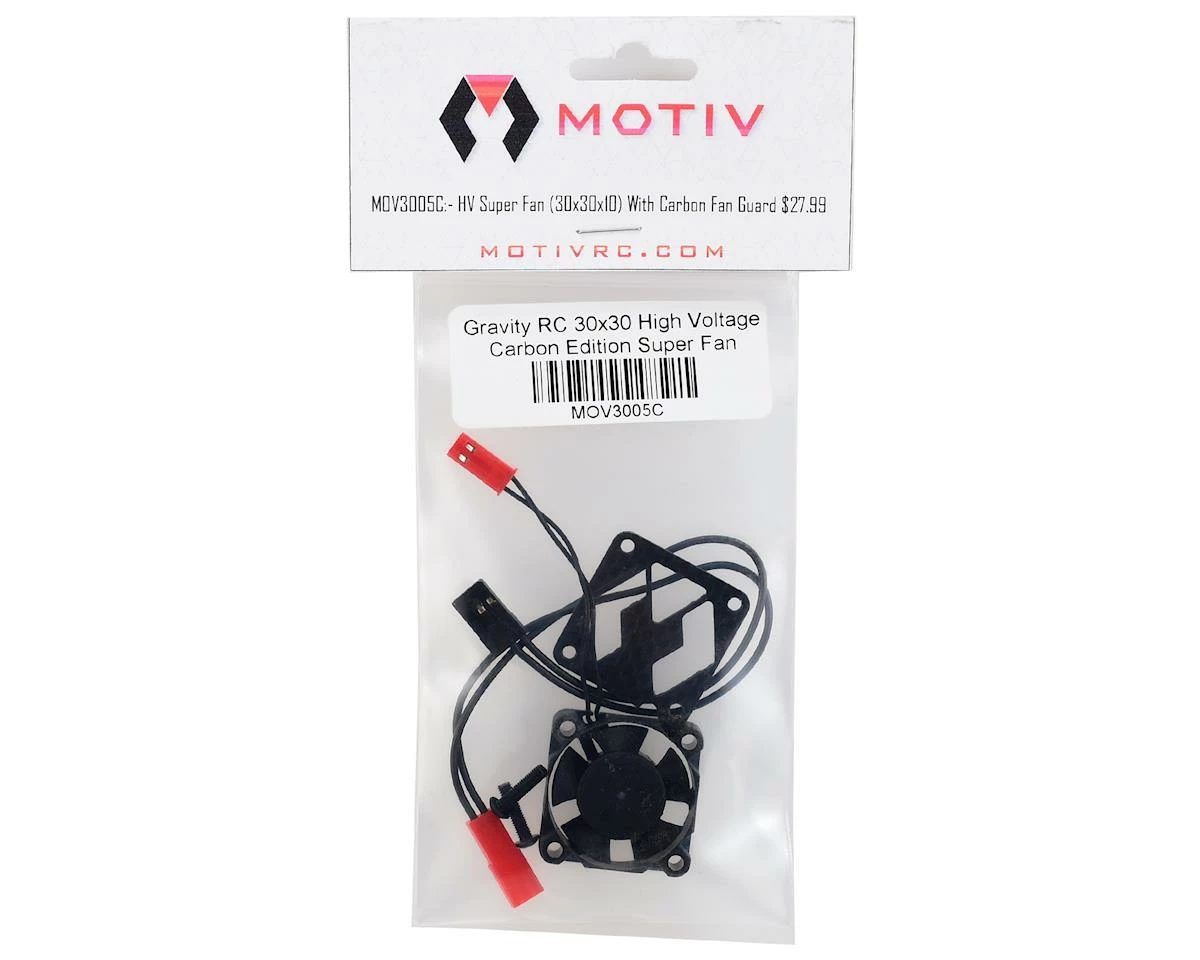 The Motiv 30×30 High Voltage Carbon Edition Super Fan features dual ball bearings and is rated to handle 8.4 volts, but will still push good air flow running off of the lower Rx voltage. Included is a MOTIV carbon fan guard to save that precious pinky from imminent annihilation.