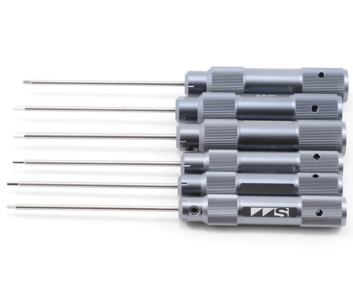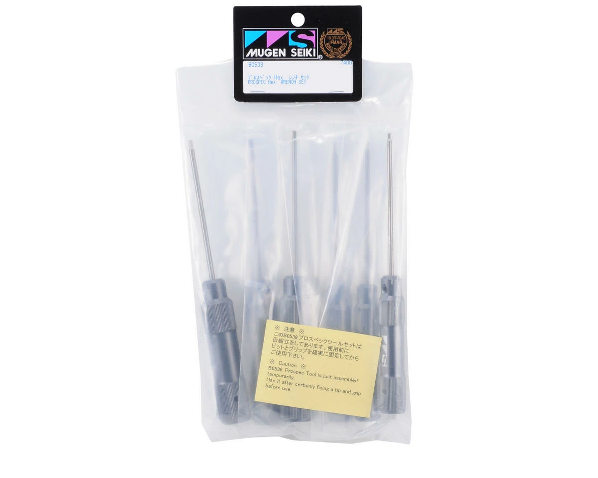 This is the Mugen ProSpec Allen Wrench Set. Featuring high quality CNC Machined, knurled handles and replaceable hardened steel tips. The handles on these tools are hollow to reduce weight and lessen fatigue, but also to allow the tips to be stored inside the handle to save space in your pit box.