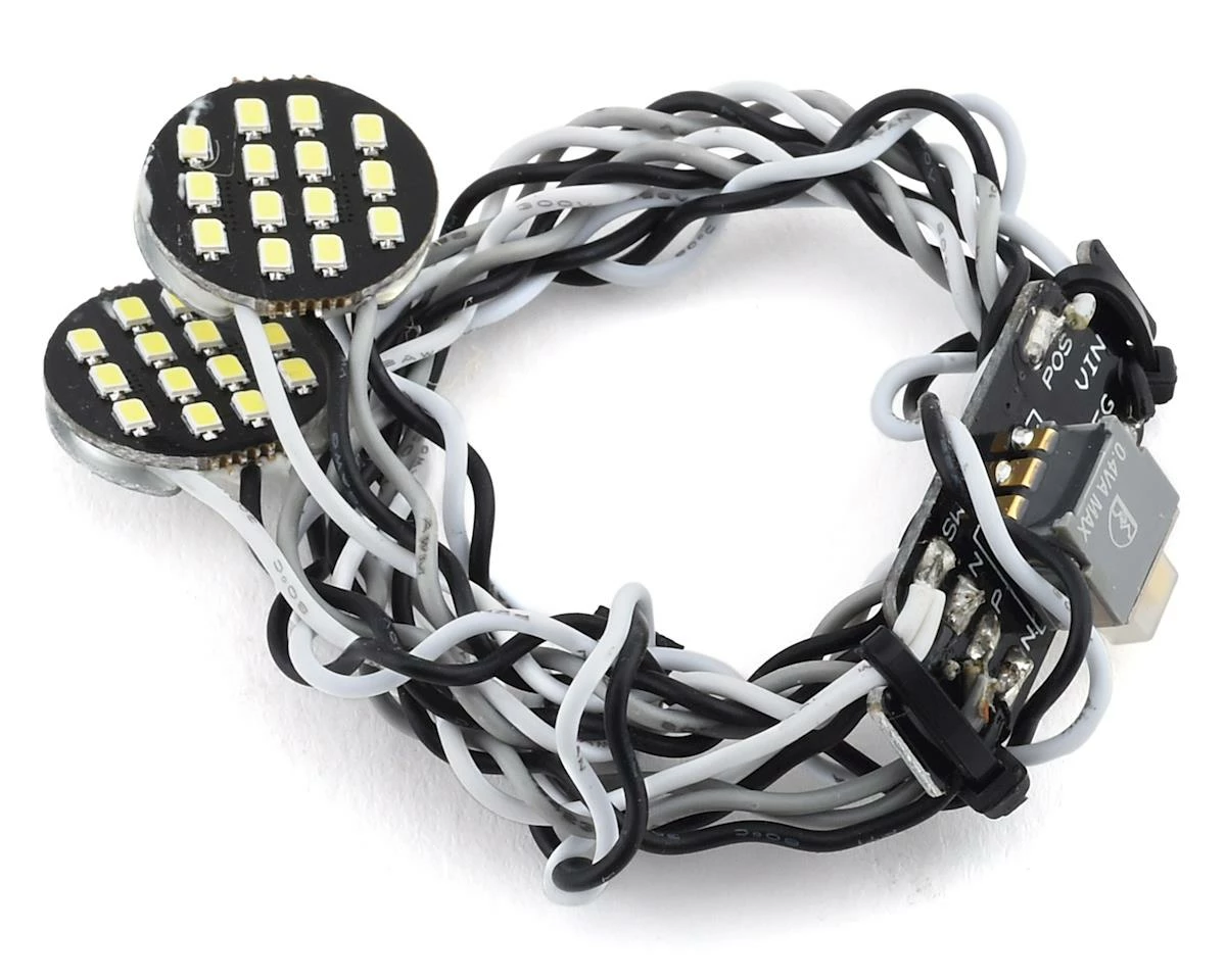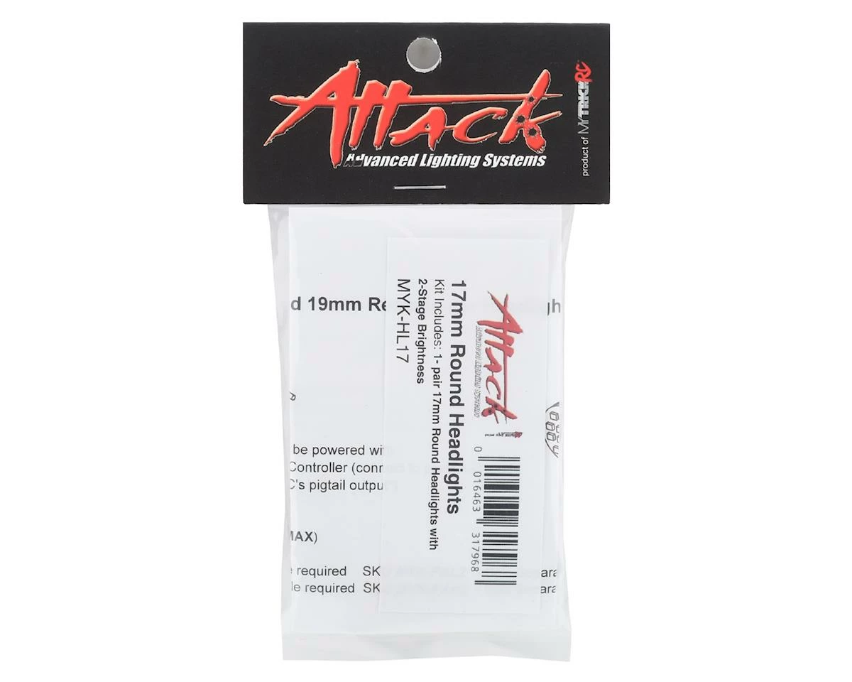 This is an optional set of two MyTrickRC Attack Phaser 17mm Round Headlights, an intensely bright LED array that brings the scale realism of aftermarket LEDS to 1/10th scale vehicles. The Cool White color of the LED array is true to full scale lights and is designed to fit any 1/10th scale vehicle with large round headlights. This versatile set is waterproof and has switchable stages that allow the user to switch on just the center LEDs or switch on the whole array for a full spectrum of brightness to light up whatever track or trail you happen to be exploring. Attack 17mm Round Headlights are designed to be plug-n-play with the MyTrickRC DG-1 Dragon Controller, UF-7 Controller, any 4-20V DC power source, or powered directly off of the receiver!
