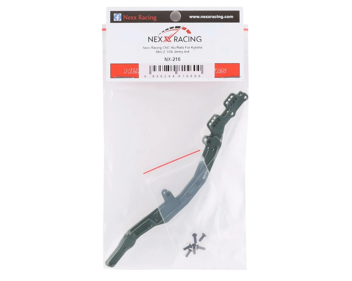 NEXX Racing Kyosho Mini-Z 4X4 Jimmy CNC Aluminum Chassis Rails. These optional aluminum chassis rails are intended for the Kyosho Mini-Z 4X4 Jimmy. Using these rails will allow for a weight reduction of over 35% when compared to the stock steel rails. Package includes two green frame rails.