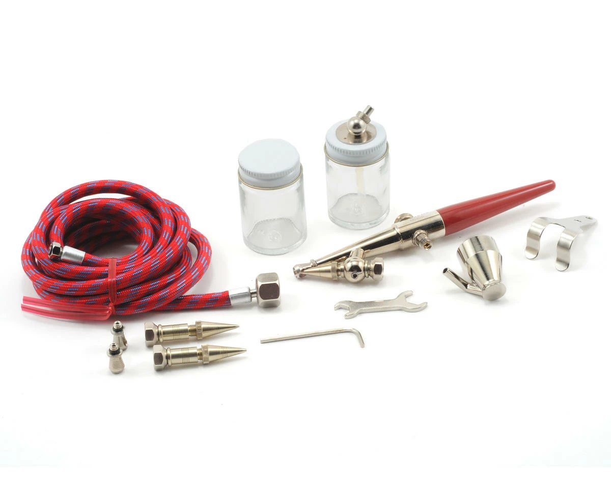 Airbrush Set. Includes One H#1L Single-Action Airbrush, size 3 & 5 spray heads, one Metal Color Cup, two Bottle Assemblies, one Bottle and Cover Assembly, two Wrenches, Hanger, one-6 Air Hose, 22 Airbrush Lessons Booklet and Parts Sheet.