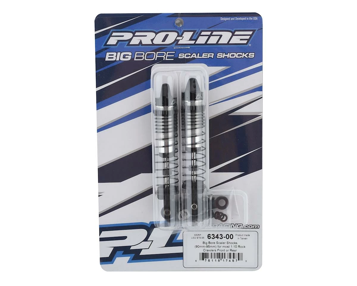 This is a set of two Pro-Line 90mm Big Bore Scaler Shocks. The large (nearly 11mm) bore allows the Big Bore Shocks to function correctly as true performance shocks due to the larger oil volume in the shock body. The shocks feature CNC machined Aluminum Shock Caps, Collars, Bodies, Bottom Caps, and Hard Chrome Coated Steel Shock Shafts all made to exacting tolerances. X-Ring seals (PRO6343-01 for replacements) are used as the main shaft seal for smooth, low friction action and to prevent leaks.