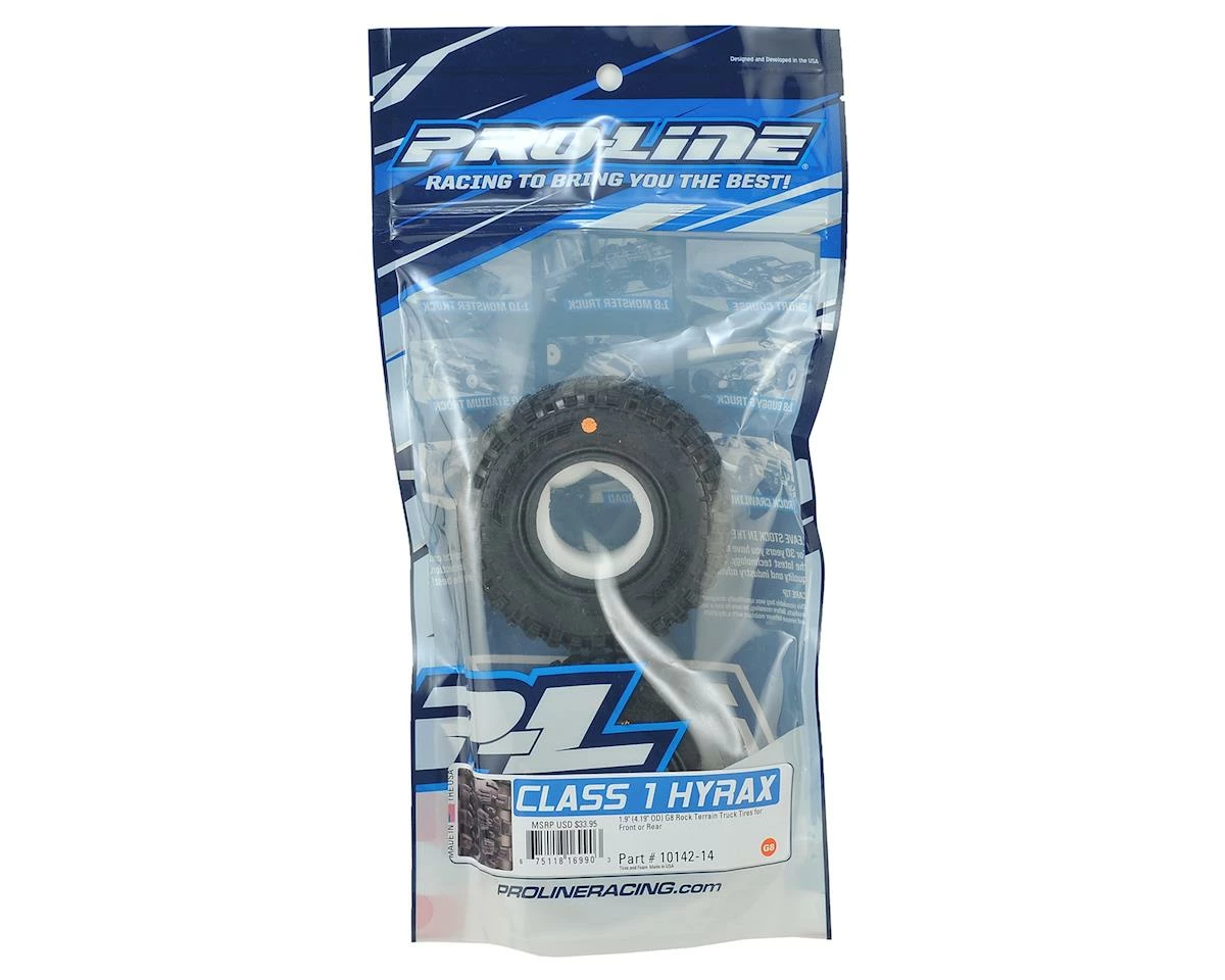 The Pro-Line Class 1 Hyrax 1.9″ Rock Crawler Tire was designed from the ground up for maximum grip on the toughest terrain. Measuring in at 4.19″ outer diameter, the Class 1 legal Hyrax tire is ready for both competition and scale adventure. The Hyrax features an aggressive and open tread pattern with each tread block containing multiple Sipes for incredible tread flex. The highly detailed connected tread on the sidewall of the Hyrax extends out for unmatched side-hilling performance and the futuristic stepped tread blocks create even more forward gripping edges that dig into slick rock, while still looking great on your scale rig.