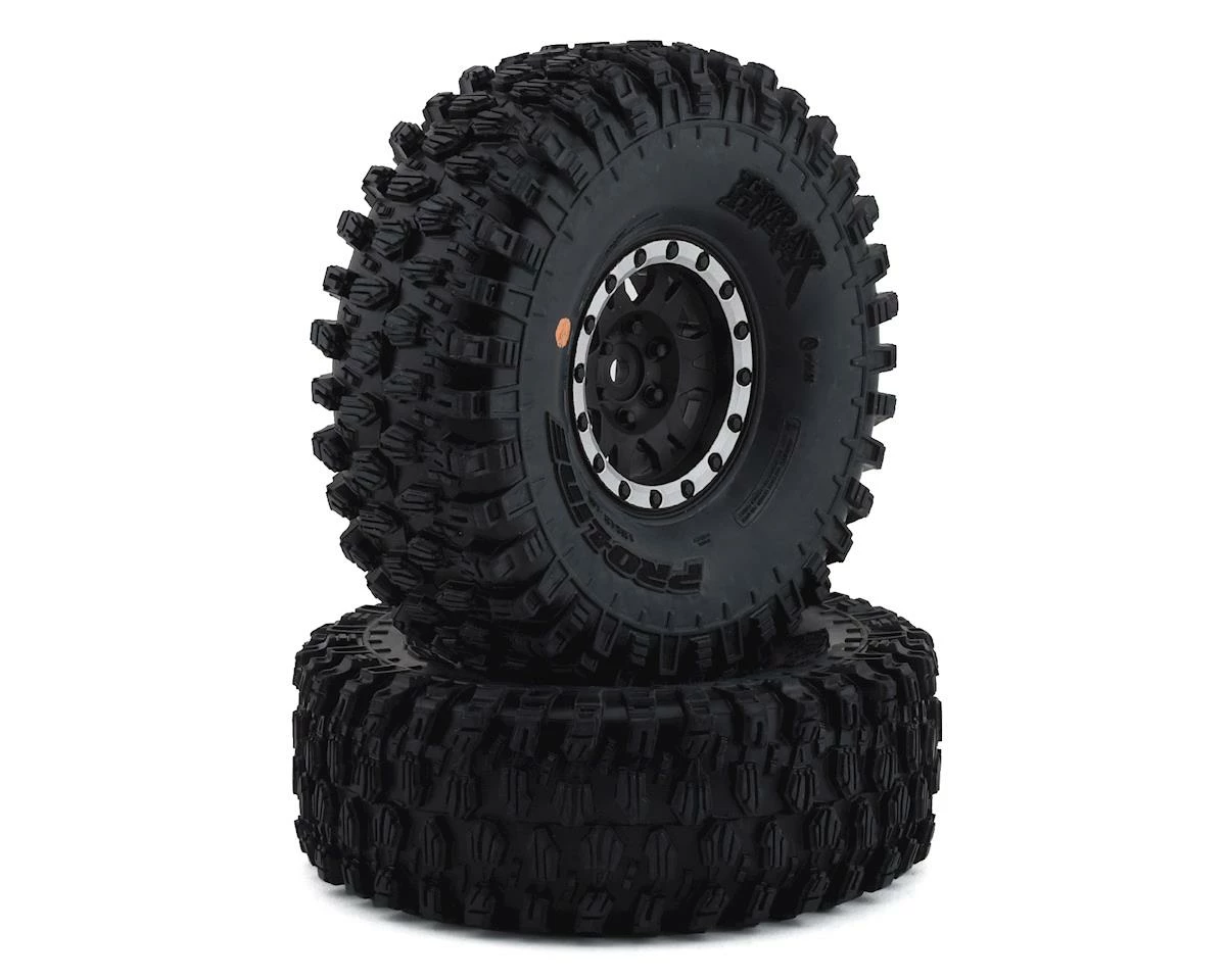 Pro-Line Hyrax 1.9″ Tires are now available mounted on Impulse Black/Silver internal Bead-Loc wheels. Designed for maximum grip on the toughest terrain, the Hyrax tire is ready for anything your Scale Adventure might throw at you. The Hyrax features an aggressive and open tread pattern with each tread block containing multiple Sipes for incredible tread flex. The highly detailed connected tread on the sidewall of the Hyrax extends out for unmatched side-hilling performance. The Hyrax also features futuristic stepped tread blocks that create even more forward gripping edges that dig into slick rock like no other scale tire Pro-Line has produced to date! The Hyrax is made from Pro-Line’s Legendary G8 material, so you know it provides performance you can depend on.