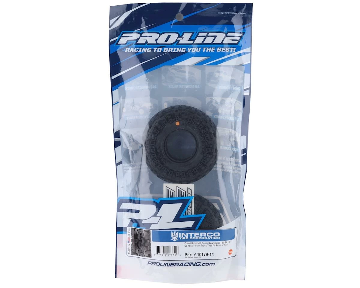 The full-size Super Swamper TSL SX features the ultimate tire tread design by pairing the distinctive chevron tread pattern with the famous, trademarked, and patented Interco TSL (three-stage lug) tread design. TSL is a lug pattern with short, intermediate, and long lugs that are each uniquely arranged, proportioned and spaced which allow them to bite quickly and self-clean rapidly. Each of these details has been faithfully recreated in Class 0 size to fit your 1.55″ wheel. Just like the full-size Interco Super Swamper TSL SX tires, Pro-Line tires are proudly Made in the USA.