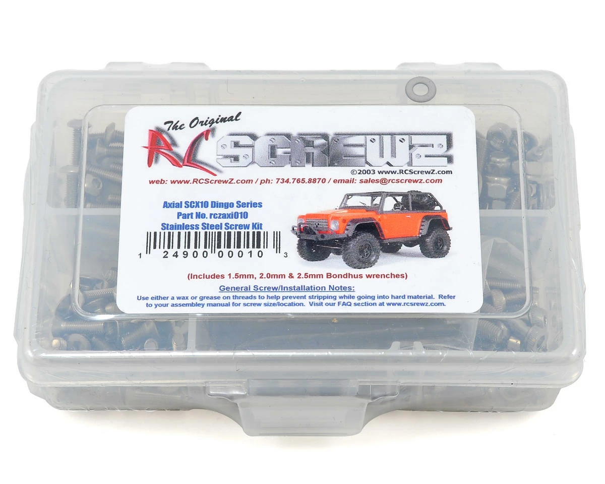 This is an optional RCScrewz Axial SCX10 Dingo Stainless Steel Screw Kit. RCScrewz stainless screw kits are 100% complete. This kit was developed specifically for the SCX10 Jeep Wrangler Dingo and may not include the screws needed for other SCX10 kits. Your kit will include everything needed to do a full conversion and more. Stainless steel screw kits are far superior to the screws that come stock with your RC. RCScrewz kits are made with the best stainless steel money can buy. No more bent, rusted, or corroded screws. Never worry about stripped heads again. You will not find a better screw kit for your RC at any price and RCScrewz Guarantee’s it. If for any reason your not 100% satisfied with your kit, return your screw kit to RCScrewz and they will send you a full refund for the price of the kit.