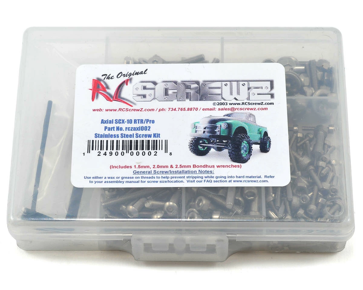 This is an optional RCScrewz Stainless Steel Screw Kit, and is intended for use with the Axial SCX10 1/10 scale rock crawler. RCScrewz Stainless Screw Kits are 100% complete. Your kit will include everything needed to do a full conversion and more. Stainless Steel Screw Kits are far superior to the screws that come stock with your RC. RCScrewz kits are made with the best stainless steel money can buy. No more bent, rusted, or corroded screws. Never worry about stripped heads again. You will not find a better screw kit for your RC at any price and RCScrewz Guarantee’s it. If for any reason your not 100% satisfied with your kit, return your screw kit to RCScrewz and they will send you a full refund for the price of the kit.