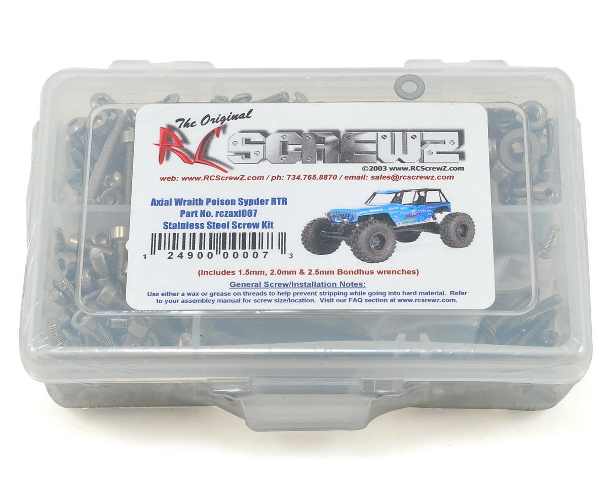 This is an optional RCScrewz Stainless Steel Screw Kit, and is intended for use with the Wraith Poison Spyder 1/10 scale rock crawler. RCScrewz Stainless Screw Kits are 100% complete. Your kit will include everything needed to do a full conversion and more. Stainless Steel Screw Kits are far superior to the screws that come stock with your RC. RCScrewz kits are made with the best stainless steel money can buy. No more bent, rusted, or corroded screws. Never worry about stripped heads again. You will not find a better screw kit for your RC at any price and RCScrewz Guarantee’s it. If for any reason your not 100% satisfied with your kit, return your screw kit to RCScrewz and they will send you a full refund for the price of the kit.