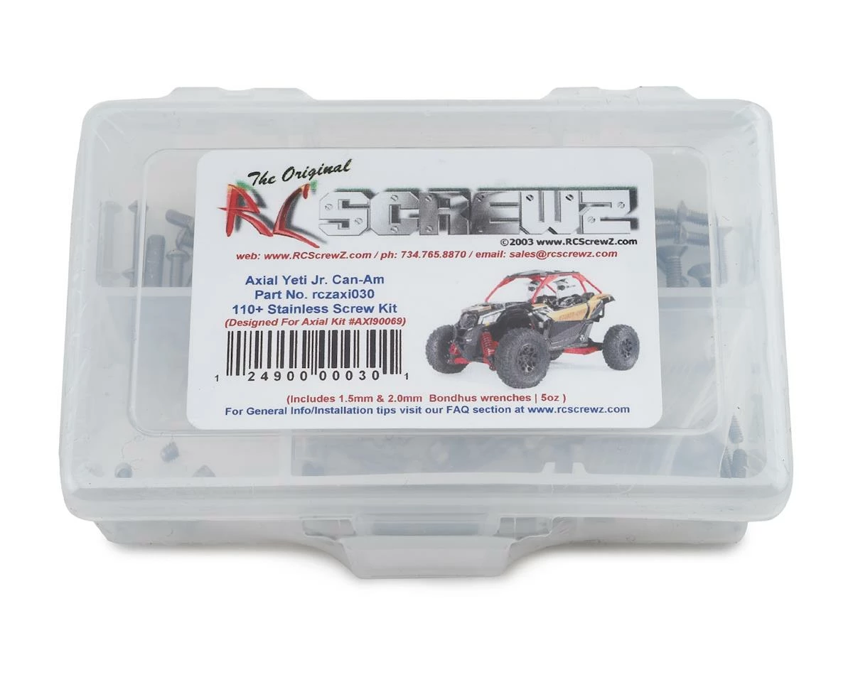 This is an optional RCScrewz Stainless Steel screw kit for the Axial Yeti Jr Can-Am Maverick. RCScrewz Stainless Screw Kits are 100% complete. Your kit will include everything needed to do a full conversion and more. Stainless Steel Screw Kits are far superior to the screws that come stock with your RC. RCScrewz kits are made with the best stainless steel money can buy. No more bent, rusted, or corroded screws. Never worry about stripped heads again. You will not find a better screw kit for your RC at any price and RCScrewz Guarantee’s it. If for any reason you’re not 100% satisfied with your kit, return your screw kit to RCScrewz and they will send you a full refund for the price of the kit.