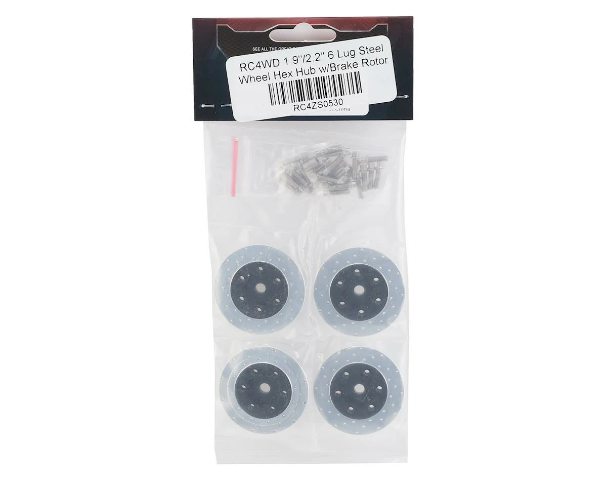 RC4WD 6 Lug Steel Wheel Hex Hub with Brake Rotor. These aluminum 6 hole hubs feature a machined in brake rotor combined with a stock offset 12mm hex and are a must have scale option for your RC4WD 6 lug steel wheels. Package includes four hubs, scale hardware, and scale hardware tool.