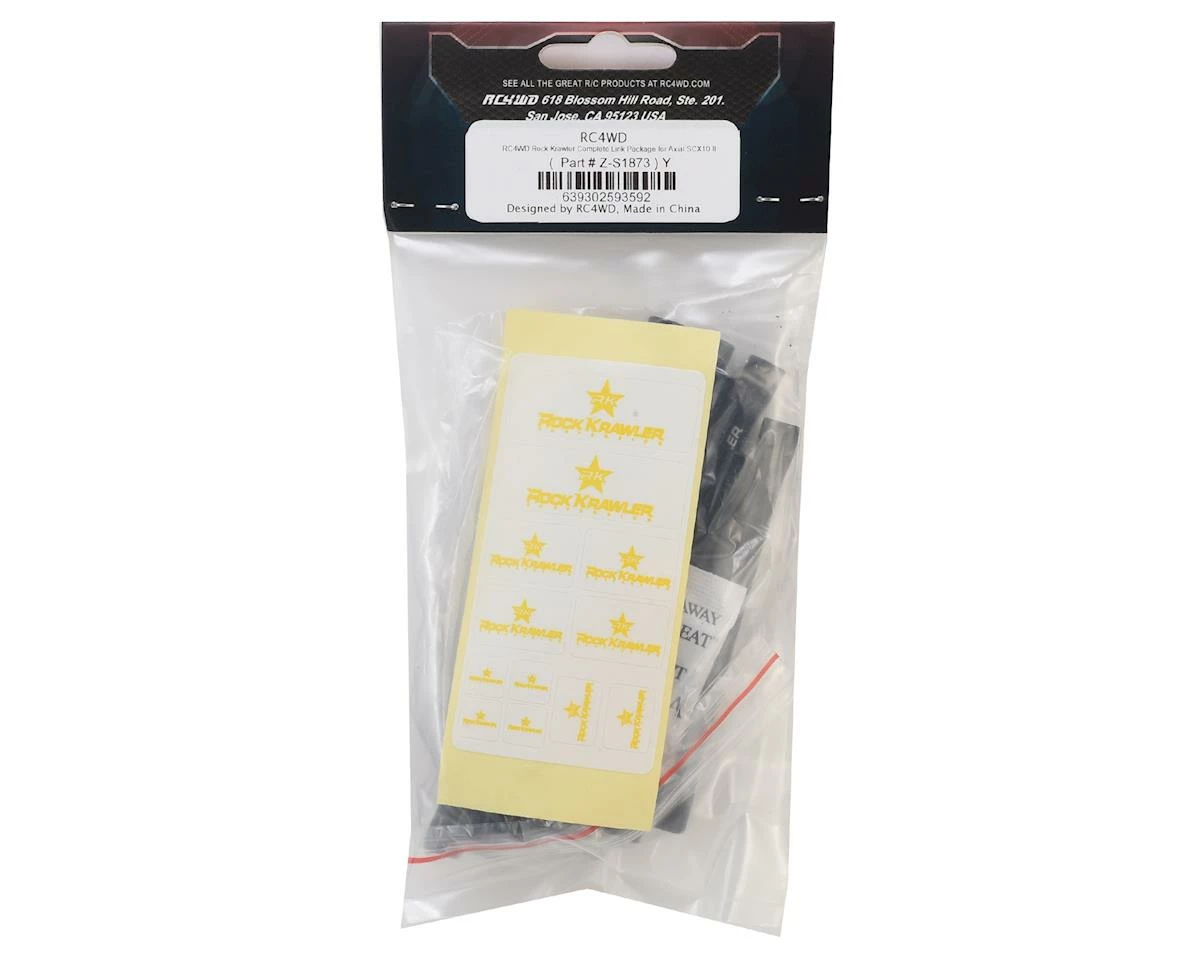 The RC4WD Axial SCX10 II Rock Krawler Complete Link Package is a great way to add realistic detail to a SCX10 II build. The Rock Krawler links are CNC machined in billet aluminum with a smooth black anodized finish. The Rock Krawler logo helps to add even more realism.