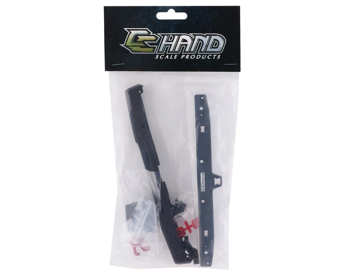 RC4WD Axial SCX10 III Jeep Gladiator OEM Rear Bumper. This optional rear bumper is made from both CNC machined aluminum and durable nylon. The included aluminum hooks are anodized red with the trailer hitch being anodized black. Package includes one aluminum bumper mount, two aluminum hooks, two lens covers, one nylon bumper and hardware.