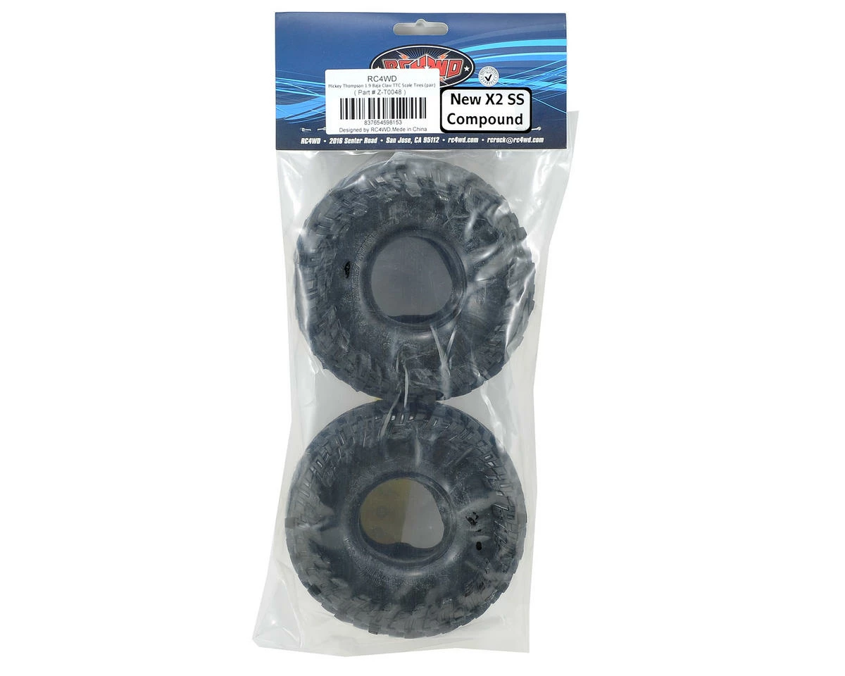 This is a pack of two RC4WD Mickey Thompson “Baja Claw TTC” 1.9 Scale Tires. These tires have been Officially Licensed by the Mickey Thompson Performance Tires and Wheels company. The unique tread pattern delivers incredible traction on rocky, rooty and muddy surfaces, while at the same time providing an impressive scale appearance for your 1.9 equipped rig.