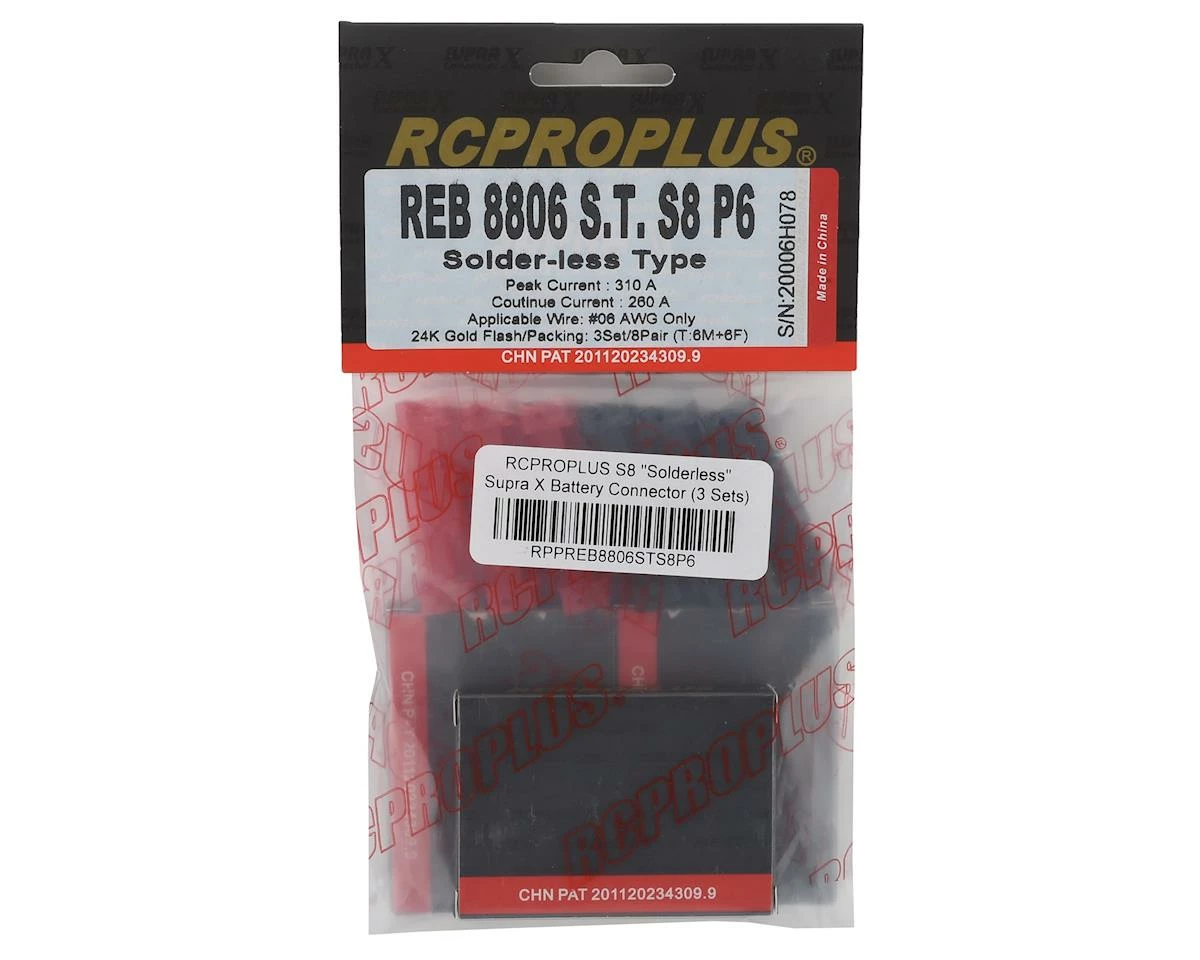 The RC Pro Plus S8 “Solderless” Supra X Battery Connector continues to push RCPP to the forefront of battery connector development. Providing high quality, and high reliability, RCPP has quickly became a leader within the industry. Solderless connetors? Absolutely! Solderless connections are commonly found in high current applications outside the R/C industry, and inherently provide lower point of fatigue within the connection.