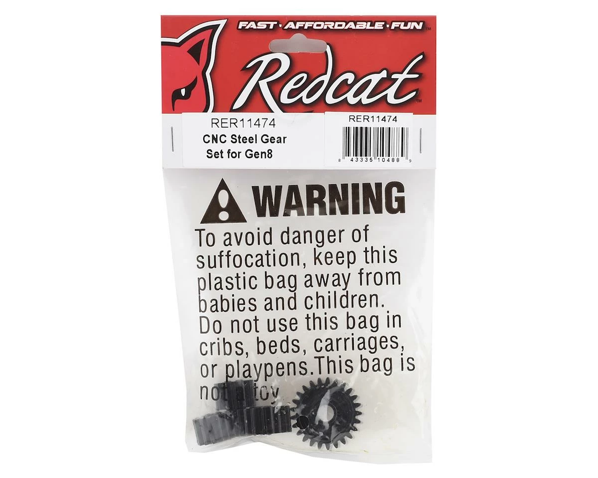 Redcat Gen8 CNC Transmission & Transfer Case Steel Gear Set. These option gears for the Redcat Gen8 transmission and transfer case offer improved strength and durability, compared to the stock gears. Package includes four gears.
