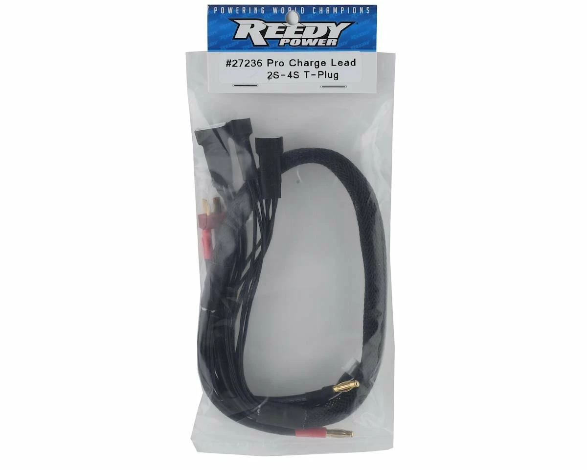 This is a Reedy 2S-4S T-Plug Pro Charge Lead, available in a variety of configurations for most batteries used in popular 1/10 and 1/8 applications. Heavy-duty 12-gauge silicone wires provide maximum current flow without overheating during high-current cycling. Mesh sheathing offers additional protection and a professional appearance while positive ends are clearly marked to prevent reverse polarity. After selecting the correct cell-count setting, simply connect the main plug and then plug the battery’s balance lead into the appropriate balance connector to charge.