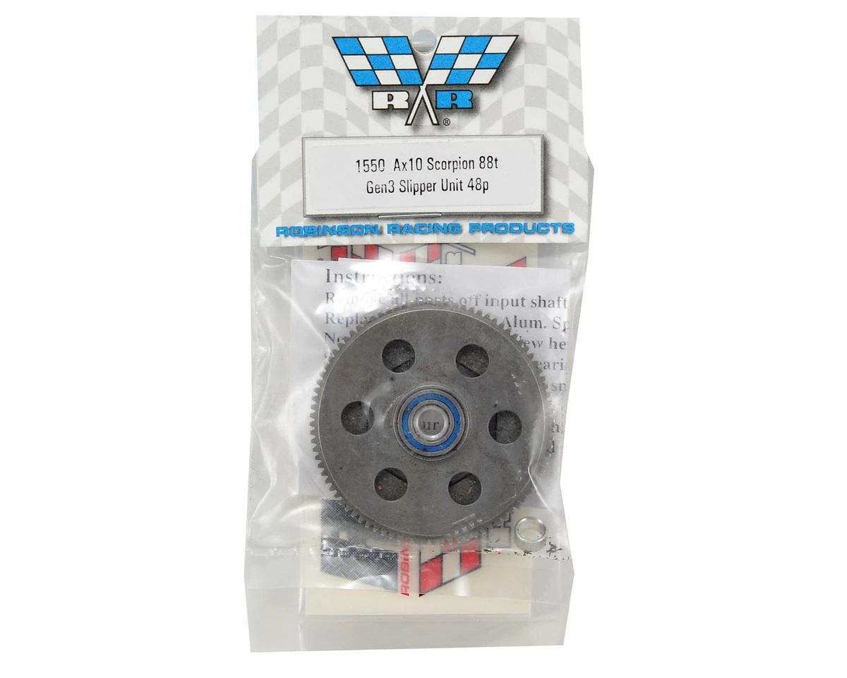 This is an optional Robinson Racing GEN3 Slipper Unit with an 88 Tooth Steel Spur Gear, and is intended for use with the Axial AX10 Scorpion. GEN3 Slipper Units will not fail under the enormous load conditions of todays brushless motor systems. The GEN3 Slipper Unit is a captured design to prevent slipper pad blowout and deliver maximum power to the ground. The hi-performance hardened steel spur gear will not fail or strip. Strong and tough gear teeth handle all the power you can pour on the spur gear. Aircraft grade billet aluminum backplate will not bend or break. Increased surface area of the oversized pad insures dependable performance. Less total parts reduces flex and wobble in the spur gear and slipper unit. Bearing included.