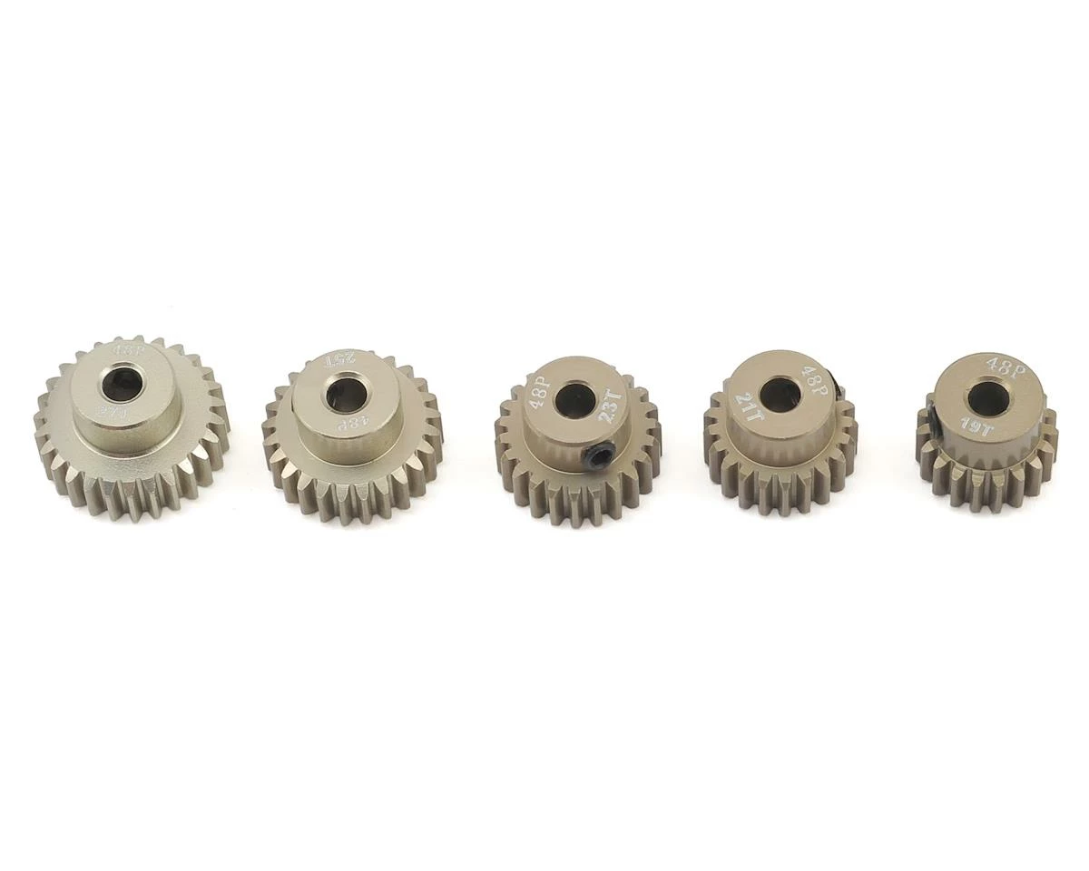 This is the Ruddog 5-Pack of Odd 48P Aluminum Pinion Gears, including 19T, 21T, 23T, 25T and 27T pinion gears. Ruddog Aluminum 48 Pitch Pinion Gears are a great option for any motor application where 48P is required and low weight and reduced rotational mass is desired. All Ruddog pinion gears are etched with tooth count and tooth pitch and include one set screw.